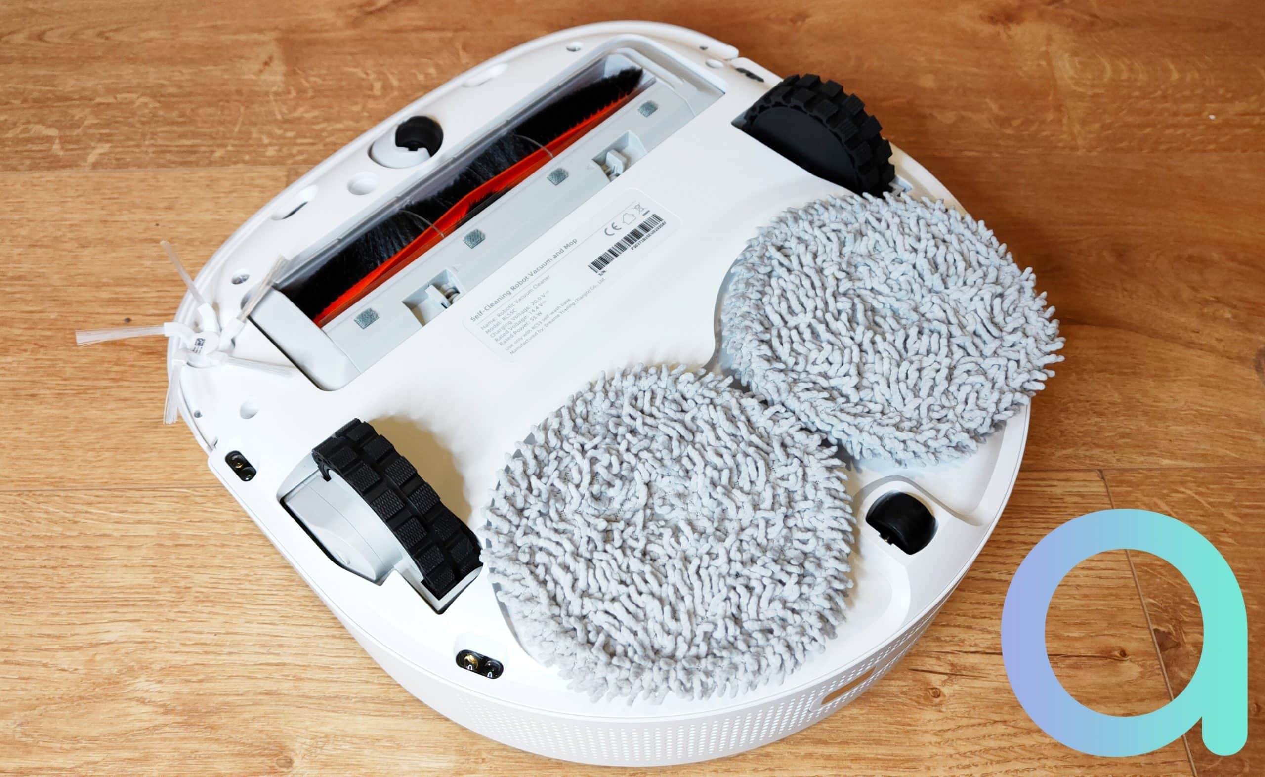 Ce qui saute aux yeux, c’est la présence de 2 serpillères pentagonales à la place de la sempiternelle microfibre qui traine lamentablement derrière l’aspirateur. Ces accessoires se mettent très facilement en place en se clipsant sur des supports magnétiques. De type serpillères à franges, elles vont tourner sur elles-mêmes à la vitesse de 180 fois par minutes et appliquer une pression de 10 N soit 10 Pa/m² ou 1,02 Kg. C’est le vrai plus de ce produit. Enfin un vrai système de lavage des sols avec une vraie action mécanique ! A changer toutes les 80 heures, en théorie.
