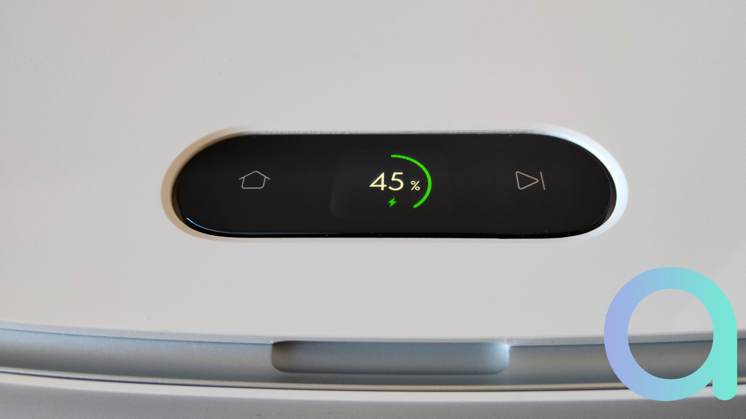 L’écran couleur vous informera de la charge, si l’aspirateur est en cours de nettoyage ou encore le cycle de lavage des serpillères (séchage, …). Le bouton home permettra de faire revenir le W10 et le second Play / Pause de lancer un cycle ou mettre l’aspibot en pause.