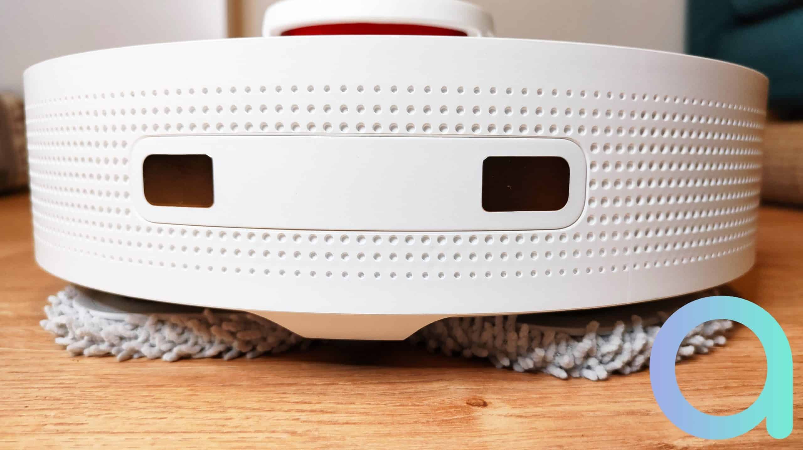 Comme sur le Dreame Bot Z10 Pro, les capteurs se font assez discrets avec seulement 2 senseurs : l’un sur l’avant et l’autre sur la droite, dans le sens de la marche. Ce sont en fait des capteurs 3D d’évitement d’obstacles qui servent également à longer les murs (capteurs de droite) et au retour à la base. La façade avant est dotée d’un bumper qui permet au robot de ne pas foncer dans les murs et les meubles, ou du moins de repartir en arrière si tel est le cas.