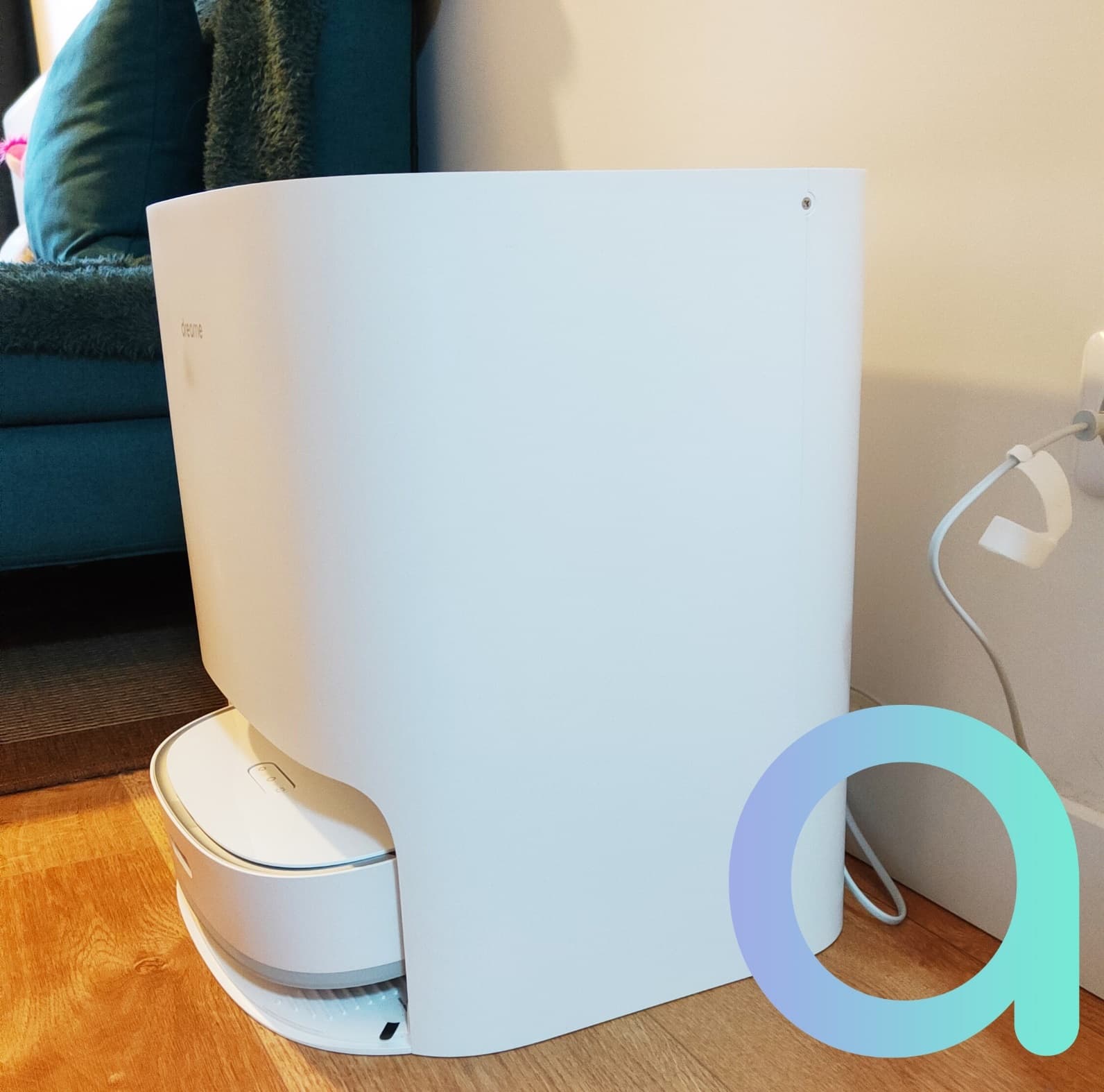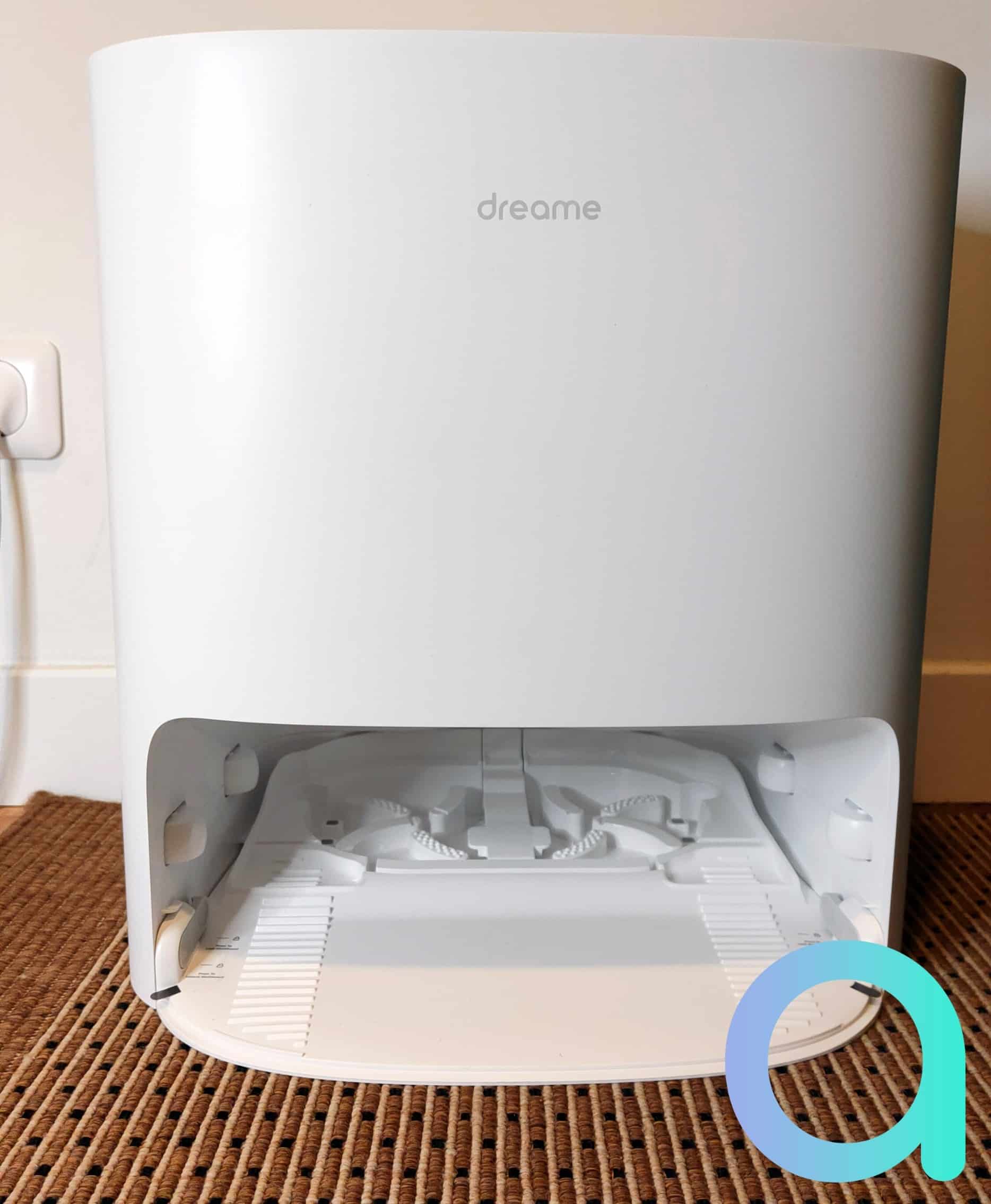 La base Dreame Bot W10 est assez imposante avec 40 cm de large, 43 de haut et 37 cm de profondeur (avec la plaque) pour un poids à vide de 8,8 Kg ! De la même couleur que le robot, ses dimensions lui permettent de pratiquement l’y faire entrer en totalité. Mais malgré sa taille, elle n’est pas moche et sa couleur blanche la rend passe-partout.