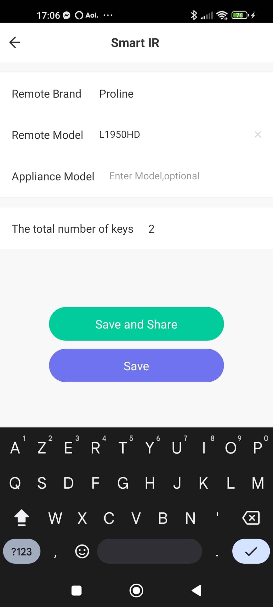 Nous avons testé l’appareil avec un vieux téléviseur de marque Proline. Nous avons commencé par la première méthode celle de la reconnaissance par la marque. Pour cela cliquez sur la petite flèche ↑ en haut à droite puis sur « add » et sélectionnez le type d’appareil qui va être configuré. Pour nous une TV.