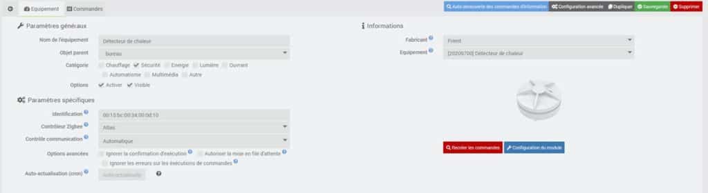 Une fois trouvé, le détecteur de chaleur Frient remonte bien comme tel. Choisissez la pièce où il sera, donnez-lui un nom et rendez le visible pour le faire apparaitre sur votre dashboard. Vous pouvez entrer dans les commandes si vous voulez, mais il n’y a pas de réelle nécessité.