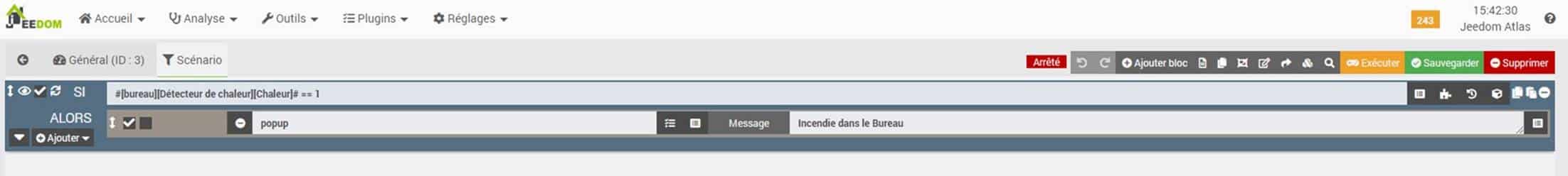 Dans la partie scénario, sélectionnez ce déclencheur. Nous sommes partis sur un modèle SI/ALORS. Si le détecteur de chaleur prend la valeur « 1 » (notez = 1 à la fin), alors une fenêtre Pop-up avec un message que vous aurez créé va s’ouvrir sur tous les appareils utilisant Jeedom. Vous choisissez le mode d’action à appliquer dans une liste. Il est ainsi aussi possible de vous faire envoyer un SMS. Mais pour cela, en plus du plug-in SMS, il faut aussi une clé 3G rattachée à votre Jeedom.