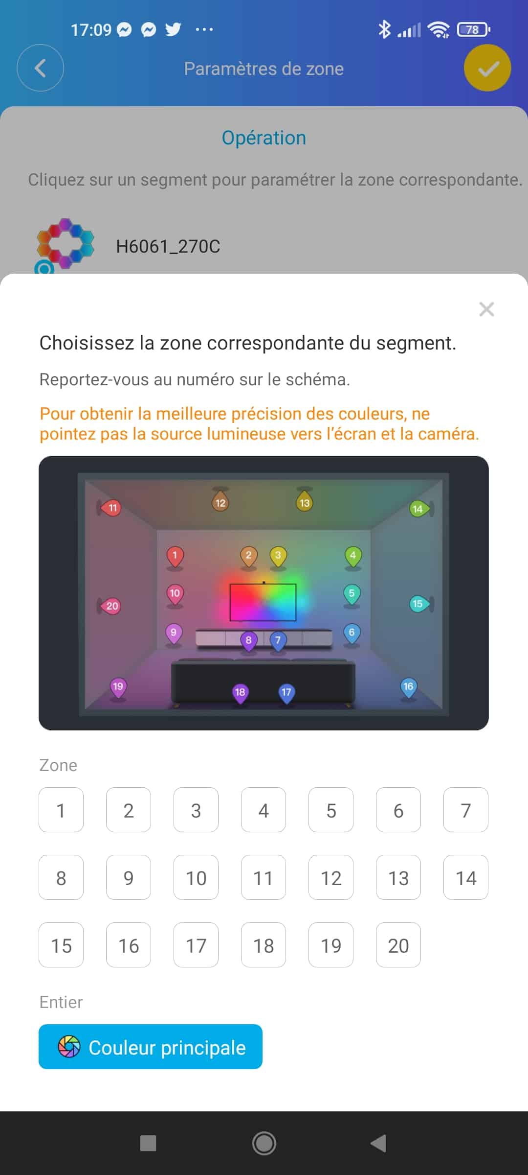 Une fois la sélection faite, il vous faut régler (ou pas) la synchronisation du second appareil, soit en réglant la vingtaine de zone individuellement, soit en cliquant sur « Couleur principale » dans « Entier ». Pour activer les zones, cliquez sur le ruban de couleur sous sa référence (ou le nom que vous lui aviez attribué)