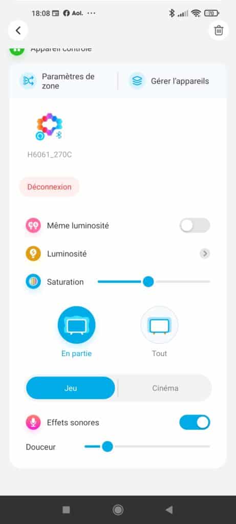 Ceci étant fait, vous obtenez votre nouveau sous menu. Les paramétrages ci-dessus peuvent être refait à tout moment, tout comme l’ajout et ou retrait d’autres dispositifs. Vous pouvez définir une luminosité différente sur chaque appareil, ce qui est parfait selon leur emplacement. Par contre, la saturation est commune aux dispositifs. La sélection de « En partie » ou « Tout » est une sorte de zoom de la caméra sur les effets de l’écran. Enfin définissez le type d’action : jeu ou cinéma. La vitesse d’exécution peut aussi être modulée si « Effet sonore » est activé. Autant de fonctions qui vont permettre de synchroniser les lumières à l’image et/ou au son.