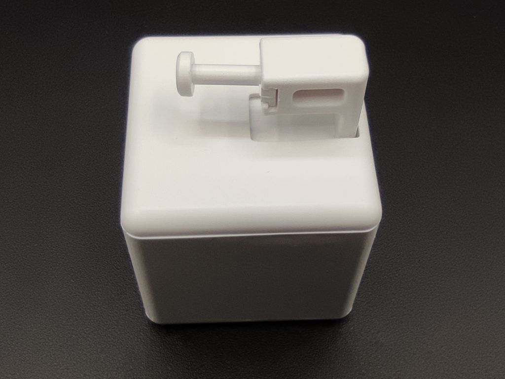 Le Moes Fingerbot n’est évidemment pas sans nous rappeler le désormais célèbre Switchbot Bot que nous vous présentions il y a quatre ans déjà. En effet, il s’agit d’un cube de 3.45 cm x 3.45 cm x 3.45 cm avec sur l’une des faces un « bras » de 1.2 cm comportant une tige clipsée et déjà en place de 1 cm de long. Clipsée car il va être possible de la changer pour une autre selon vos besoins. Ce petit cube pèse 38 grammes, pile incluse. Sur la partie supérieur un bouton physique qu’il suffit d’effleurer pour voir le bras se mouvoir.