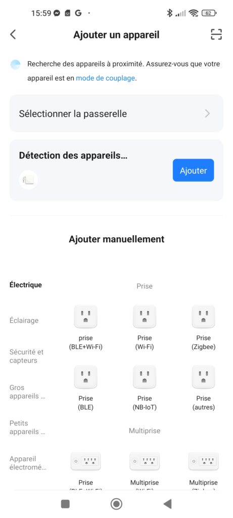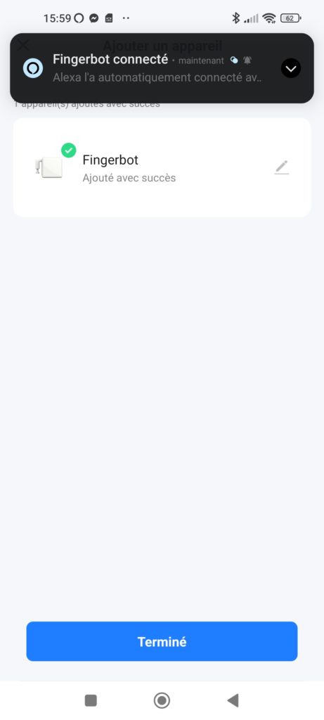 Grâce au BLE (Bluetooth Low Energy) de la passerelle, le Fingerbot est automatiquement reconnu. Cliquez dessus pour confirmer son ajout. Un message vous propose « d’adhérer », ce n’est pas un abonnement, mais juste une traduction un peu hasardeuse qui permet d’appairer le bouton connecté à la passerelle. Ceci fait, l’appareil apparait dans la liste des dispositifs. En cliquant sur son icône, vous accédez au menu de l’appareil, dans lequel nous retrouvons nos assistants vocaux favoris.