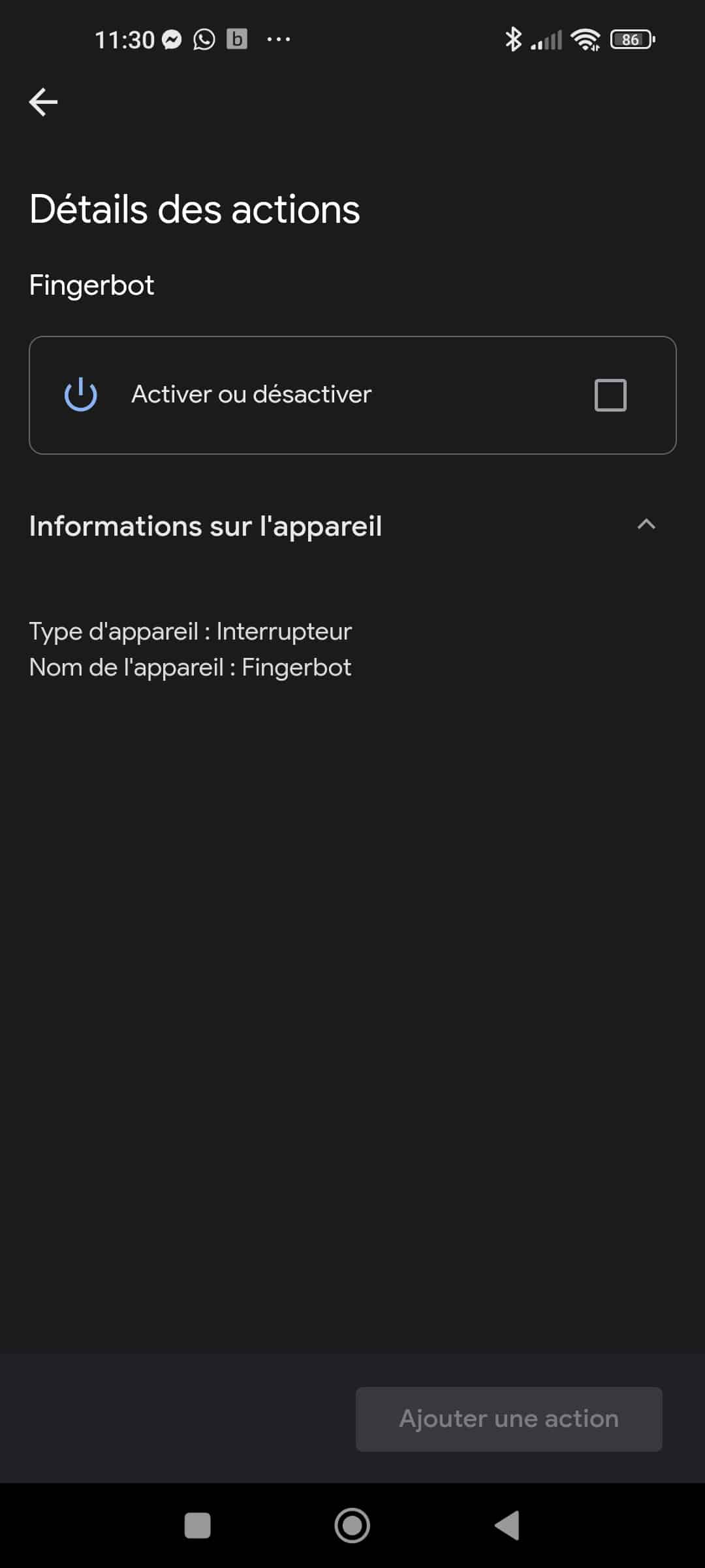 On retrouve également le Fingerbot en tant qu’interrupteur sur la page d’accueil à partir du moment où l’extension Smart Life est liée à Google Home. Pour activer le bot depuis l’application, cliquez sur la tuile. Un appui prolongé fait rentrer dans le dispositif mais n’offre rien de plus. Que l’état soit Allumé ou Eteint, un clic lancera le mouvement. Ici aussi, l’appareil est disponible pour les routines.