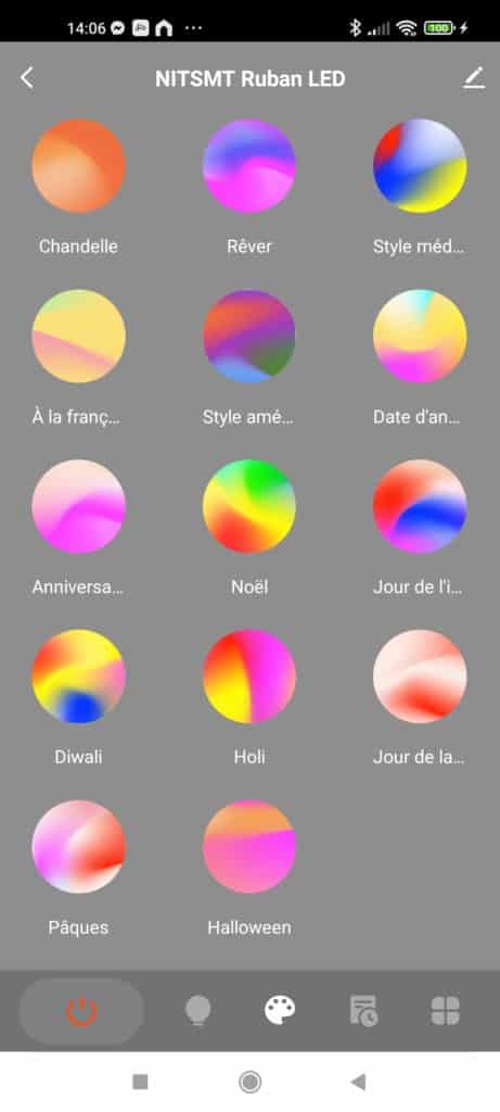 - Une « Palette » qui correspond à Scène. Au nombre de 29 pré-réglées, c’est ici que l’on retrouve les « vrais » blancs chaud ou froid via « Bonne nuit » pour le chaud ou « Travail » pour le froid. Elles ne sont pas modifiables mais en cliquant sur le « + » en haut on peut en créer.