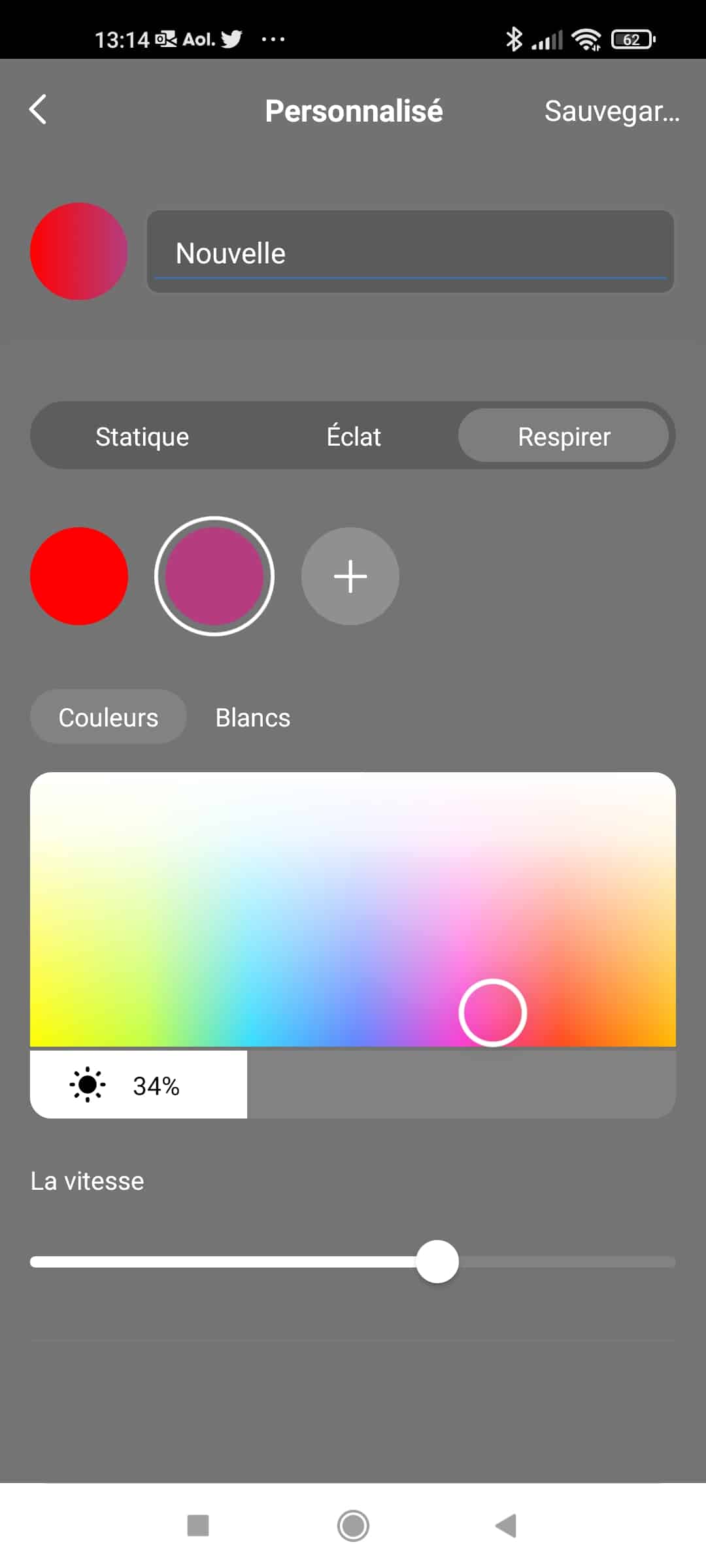 - Définissez le mode de défilement : Statique, Eclat (clignotement), Respirer (enchainement plus lent des couleurs, sorte de fondu entre chaque teinte),