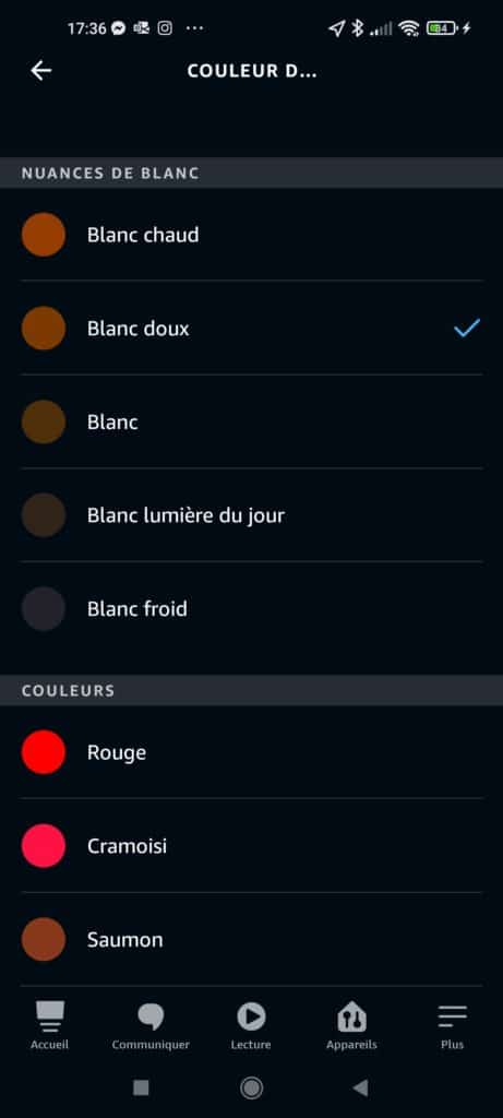 Sans surprise, le ruban remonte dans l’application Alexa si la Skill Smart Life est installée et les comptes liés. Il sera aussi nécessaire ici de renommer le ruban en cliquant sur la roue crantée. Via l’application, le bouton virtuel allume/éteint, la réglette permet de moduler l’intensité de 1 à 100%. Avec la pastille « Couleur » on ouvre la page pour sélectionner l’un des 5 blancs disponibles (le blanc doux n’est pas très contrasté du blanc froid) ou l’une des 15 couleurs que l’application Alexa propose. L’intégration à une routine est possible.