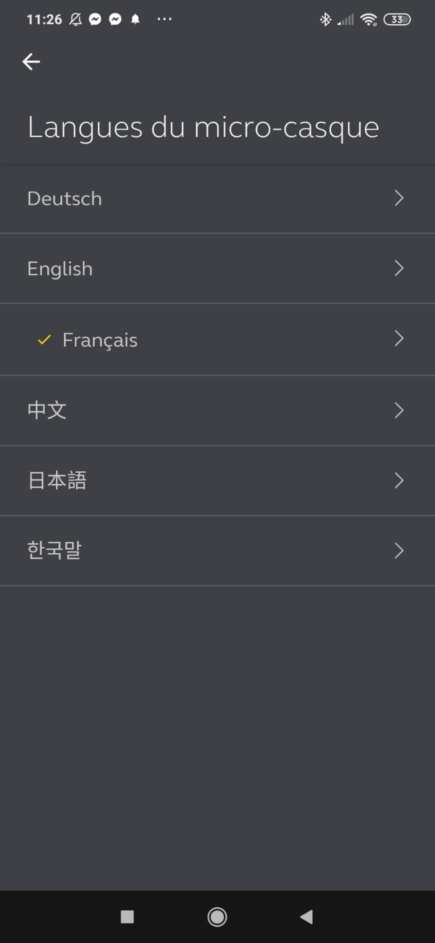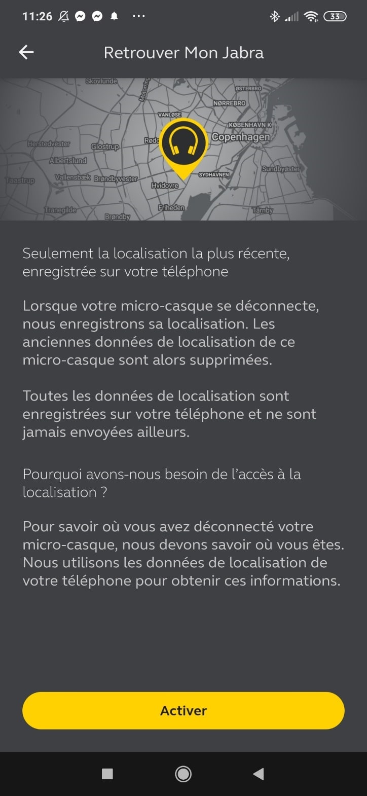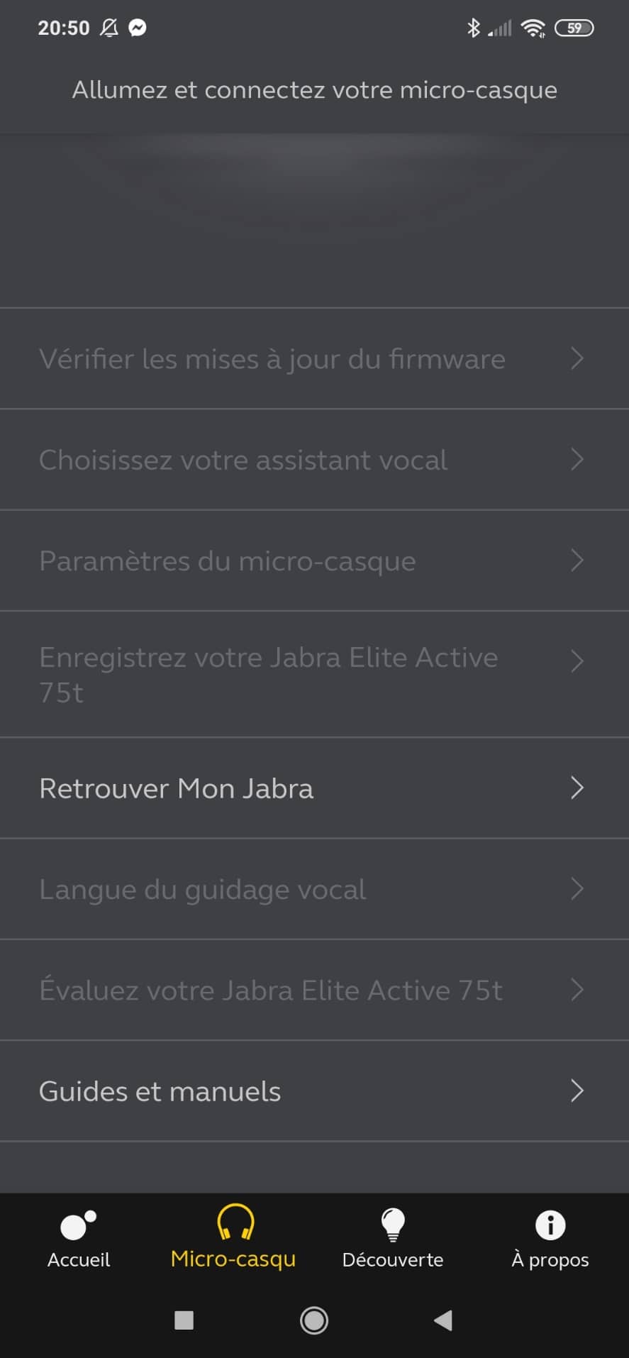 Mais ça ne s’arrête pas là. En allant sur l’onglet « mon casque », de nouvelles personnalisations sont possibles. Tout d’abord, vous pourrez mettre à jour le firmware si nécessaire. Vous pouvez aussi enregistrer votre casque auprès de Jabra, évaluer le produit, accéder aux guides et manuels. Plus intéressant, vous avez la possibilité de changer la langue du guidage vocale, que vous entendrez dans vos écouteurs. Pour cela, une mise à jour sera nécessaire après téléchargement du pack langage. Le paramètre retrouver mon Jabra est plus un gadget permettant de retrouver votre 75t en fonction de son dernier emplacement connu (avec GPS actif).