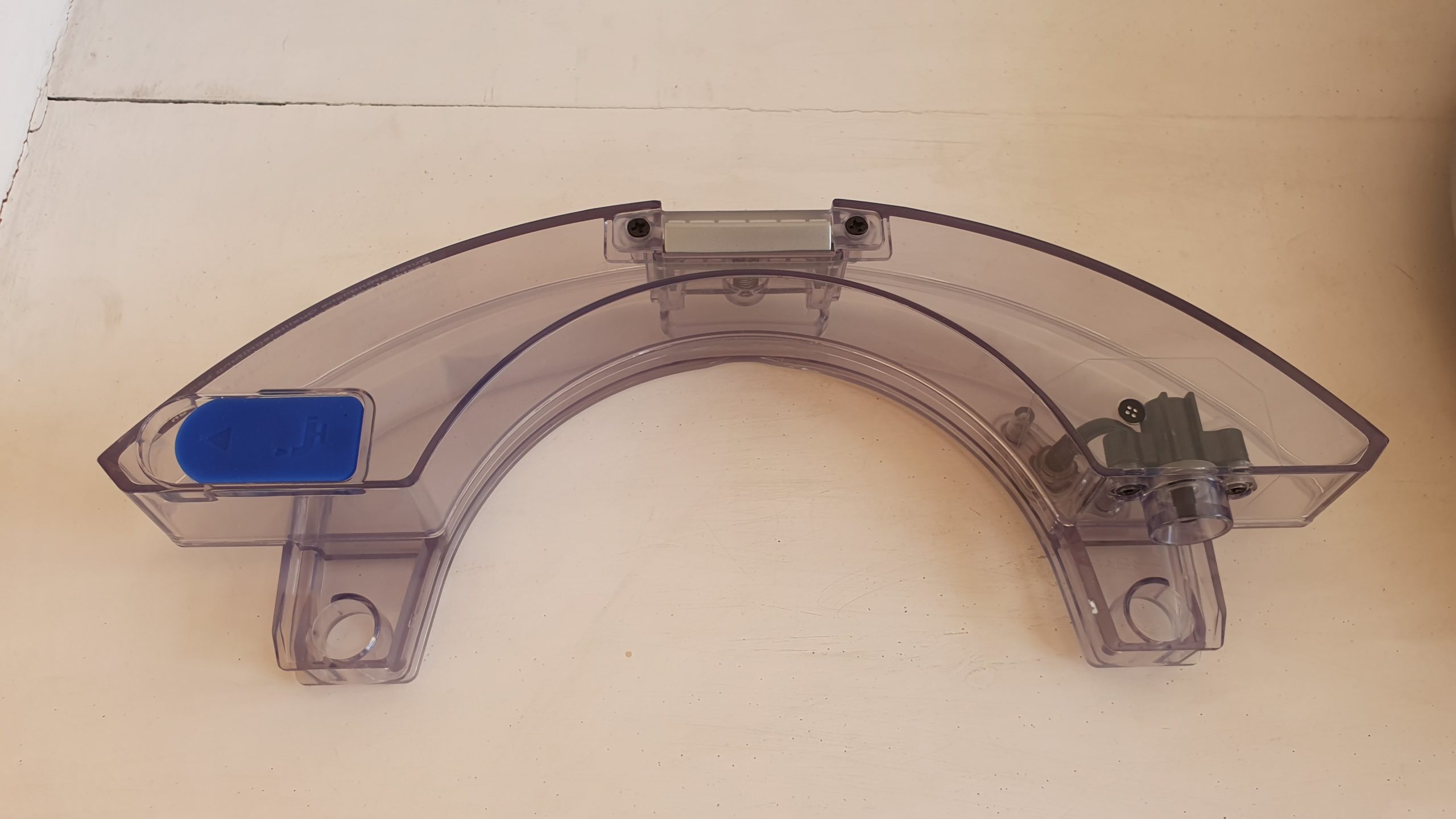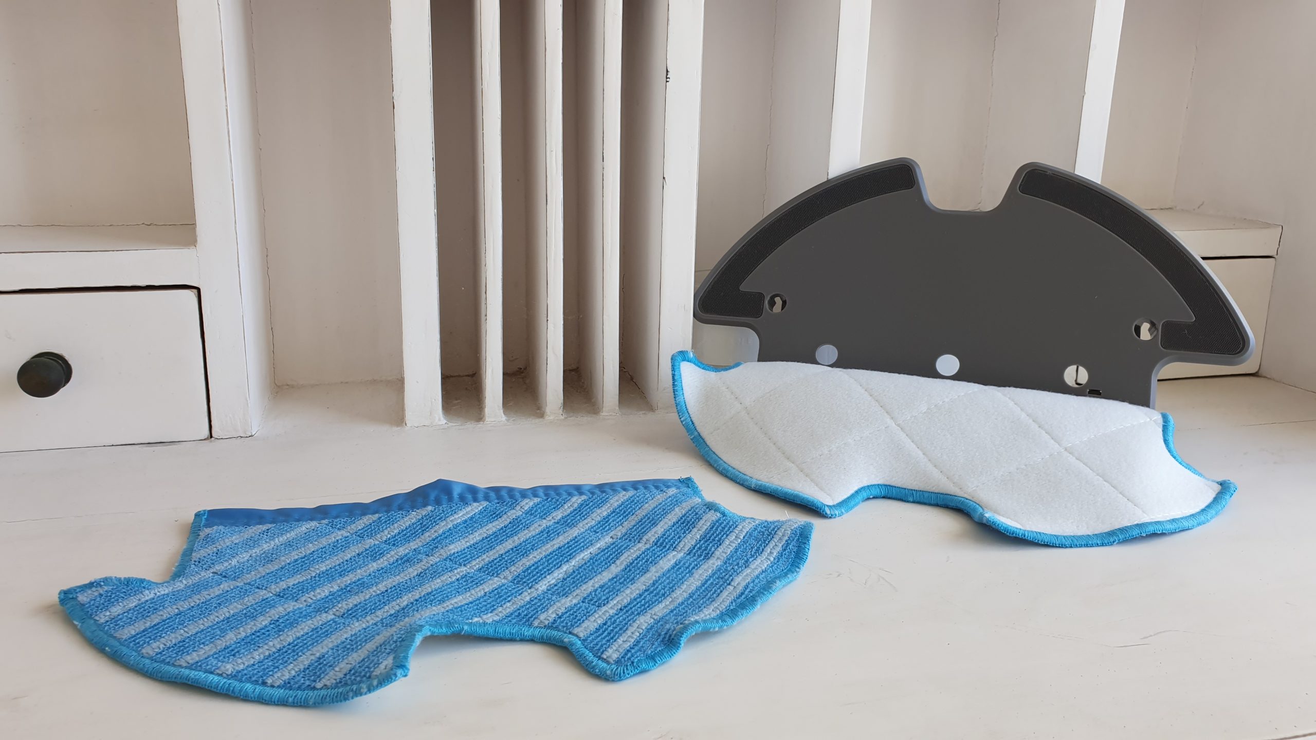A l’arrière de l’appareil, deux orifices permettent de placer très facilement une plaque en plastique munie de scratchs pour venir y accrocher une serpillière plutôt vaste pour ce type d’appareil, signe que l’Evovacs Deebot Ozmo 900 est probablement un bon laveur en plus d’être un efficace aspirateur.
