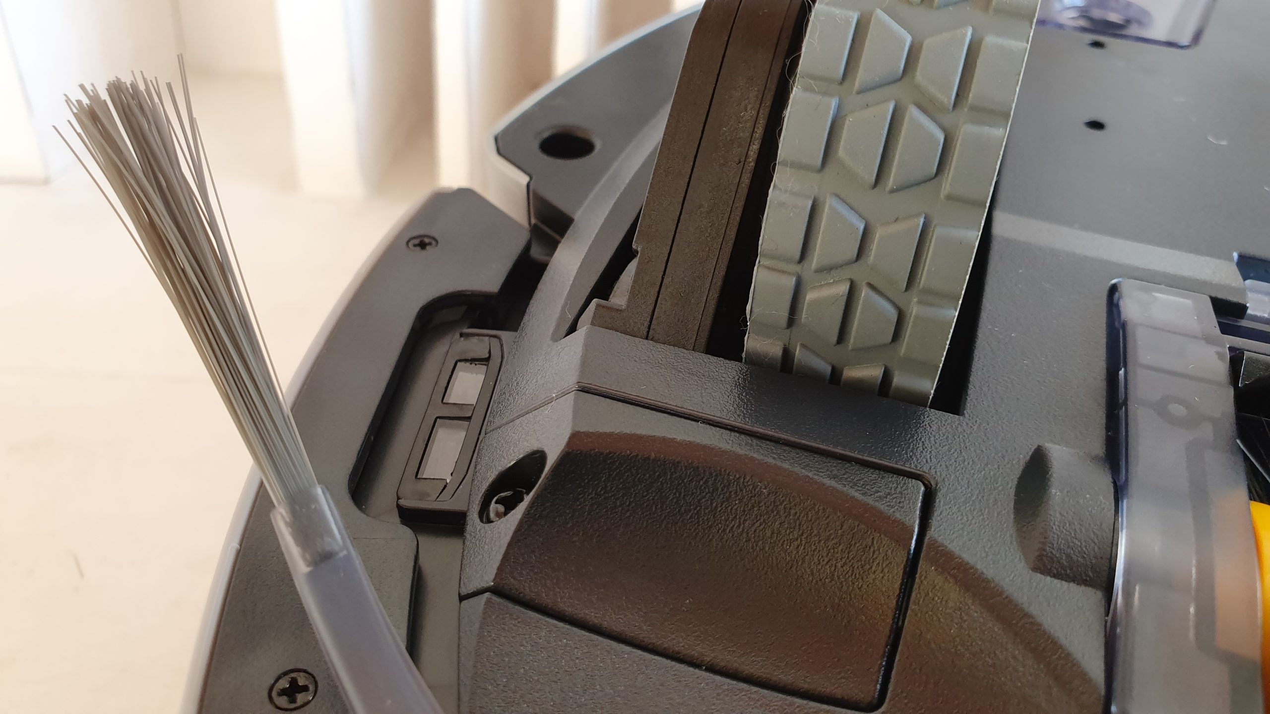 L’aspiration est assurée par une bouche centrale munie d’une brosse rotative équipée de raclettes en caoutchouc et d’une ventouse pour un bon contact avec le sol. Celle-ci présente de deux barres empêchant les gros objets ou débris de venir la bloquer – on pense notamment aux fils qui traînent bien souvent dans nos maisons connectées. La brosse semble d’ailleurs plus qualitative que sur d’autres modèles, ses poils étant souples et leur densité élevée. Les deux brosses latérales sont elles-aussi parfaitement en contact avec le sol grâce à une conception intelligente qui leur permet de mieux ramener les saletés vers la bouche d’aspiration.