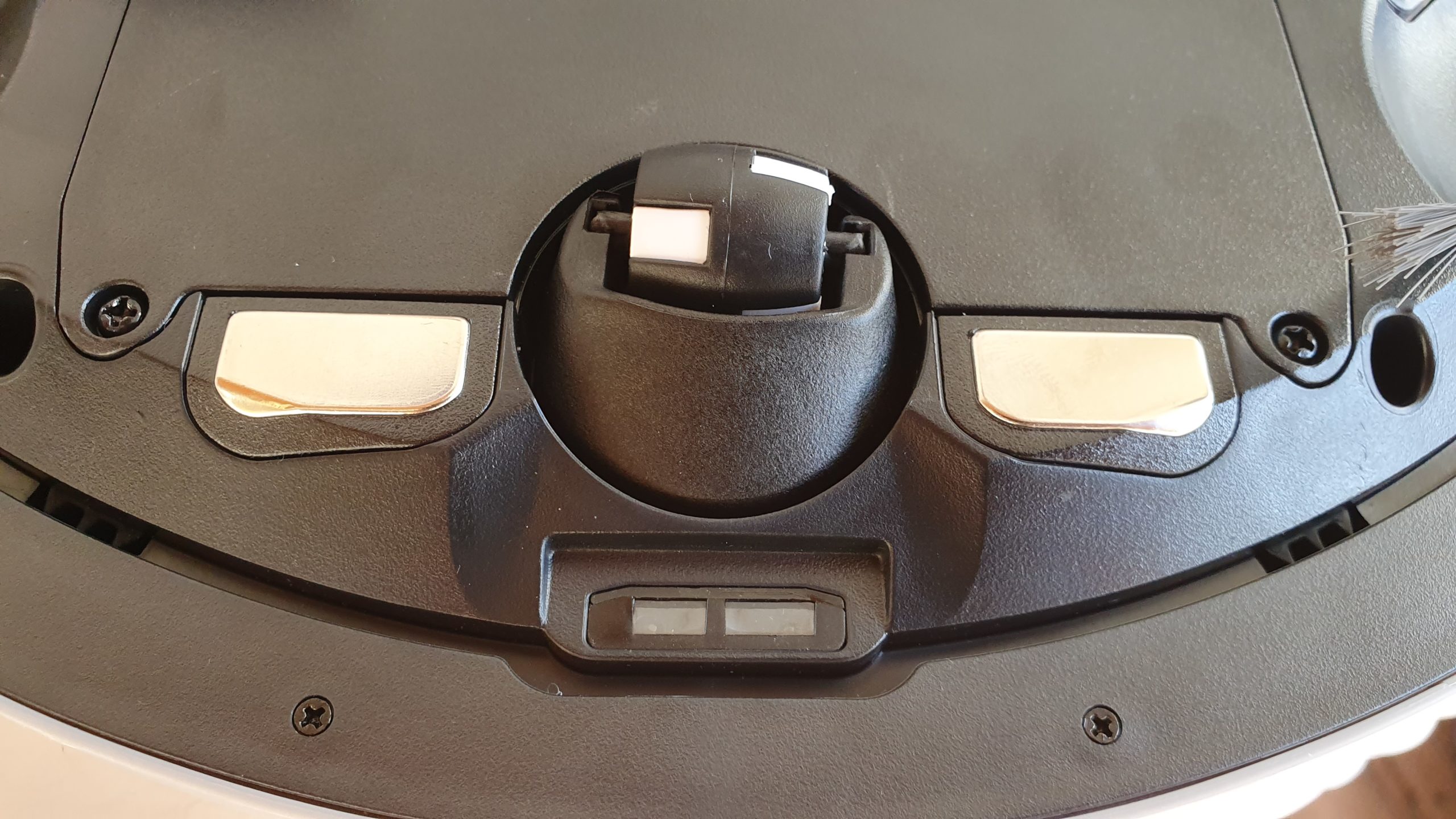 Mais voyons un peu ce qui se trouve dessous… Comme la plupart des robots aspirateurs, le Deebot Ozmo 900 se déplace grâce à trois roues : deux centrales placées de chaque côté de l’appareil et une roue directrice située à l’avant. Deux contacteurs pour sa recharge sont placés de part et d’autre de la roue avant.
