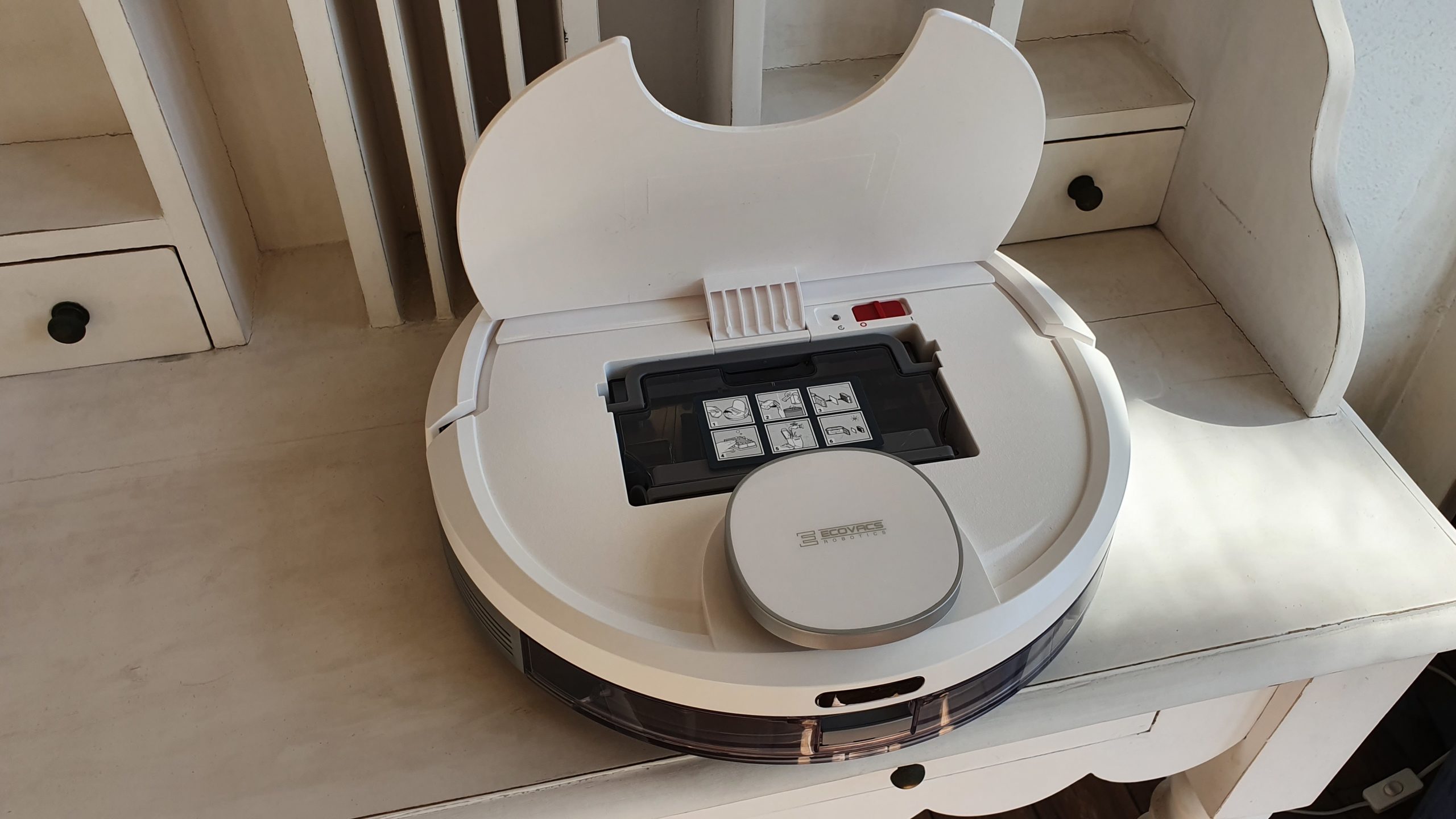 Le premier est à relativiser : Ecovacs ne fournit pas de télécommande. Certains le regretterons, peut-être, s’ils ont à la maison des réfractaires aux nouvelles technologies. En effet, sa télécommande principale sera notre smartphone, notre tablette, ou encore Alexa mais il ne sera pas forcément très adapté aux personnes âgés ou non technophiles par exemple. Notons qu’un simple appui sur son bouton d’alimentation permet tout de même de lancer un nettoyage automatique tout à fait efficace.