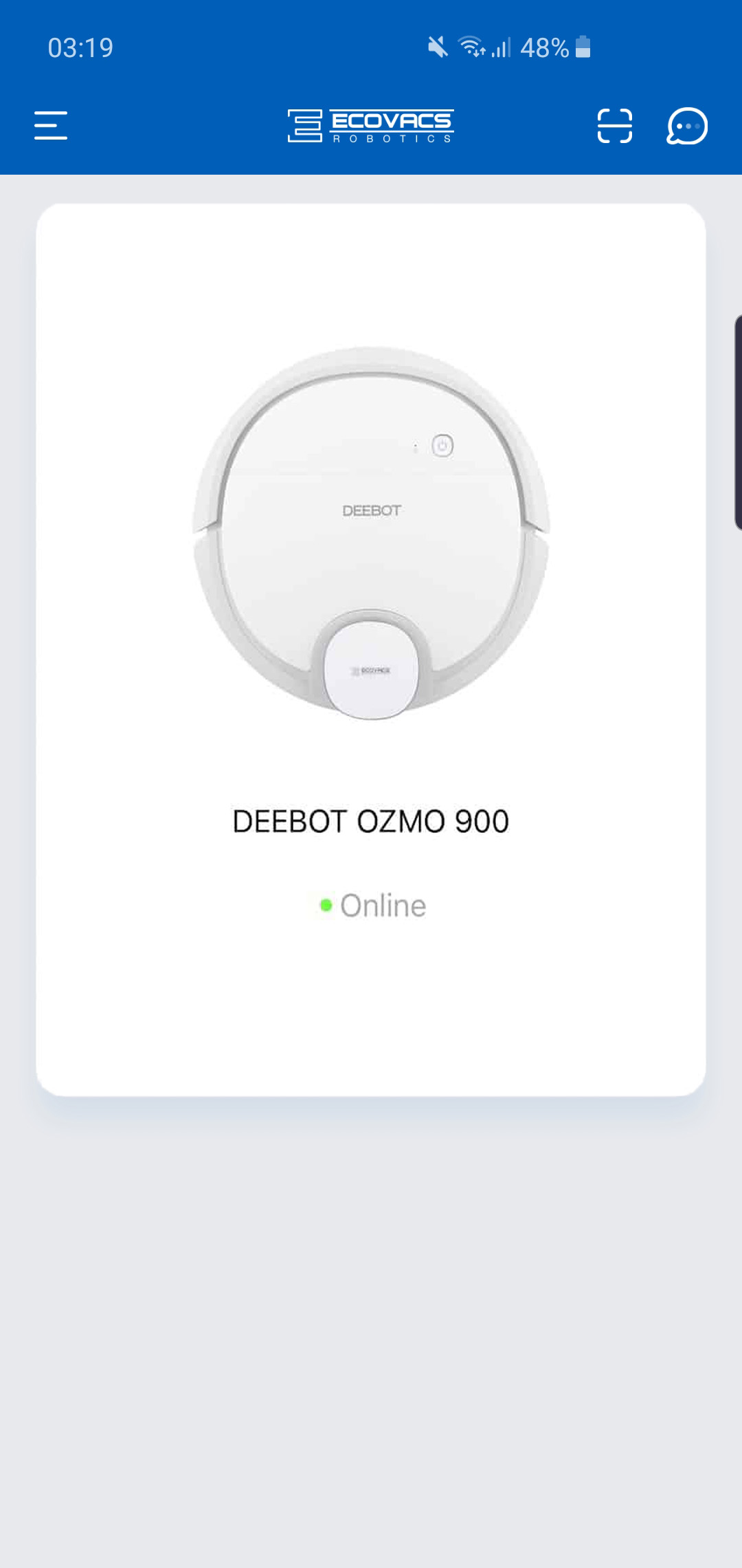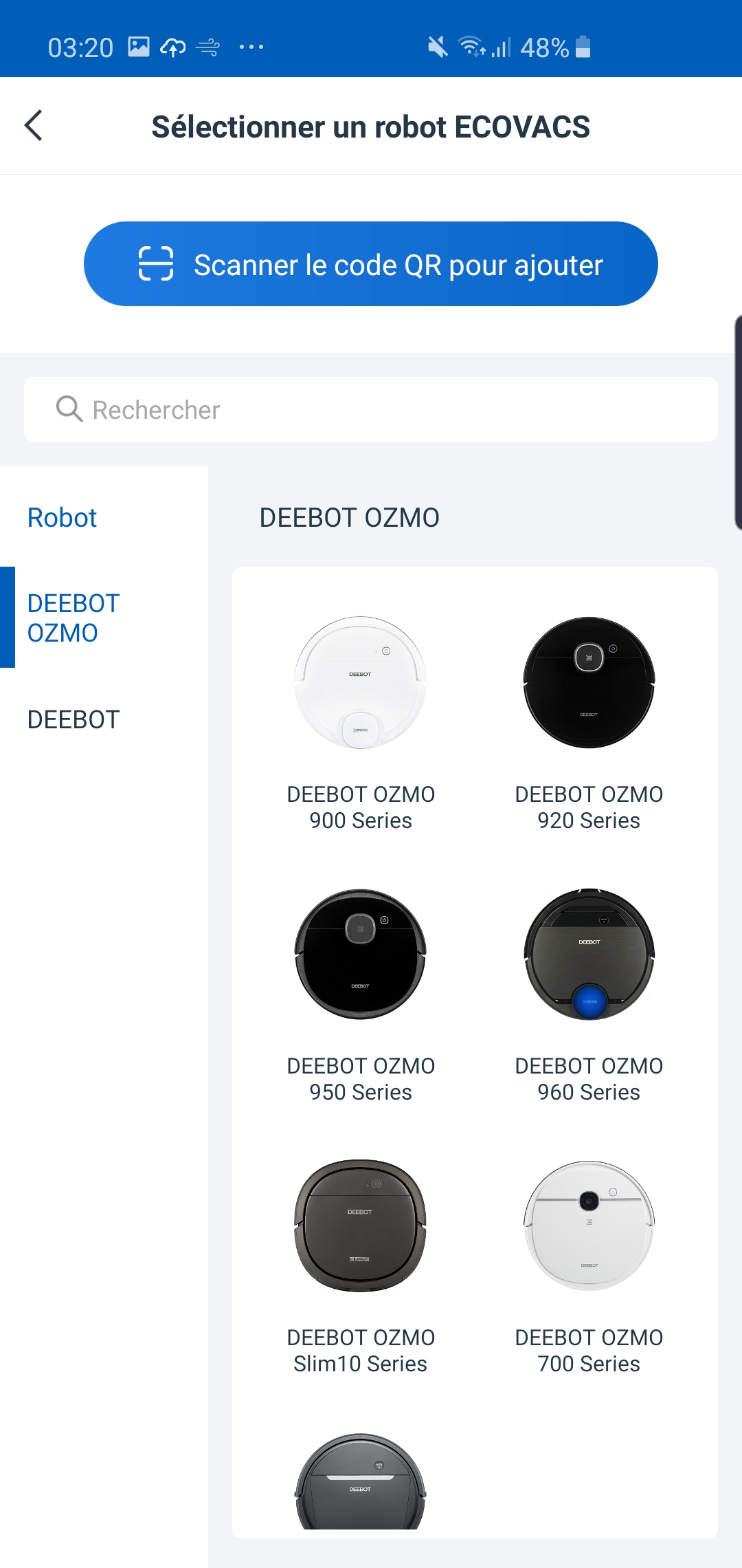 L’application offre un double menu comprenant tous les robots connectés d’Ecovacs : 17 appareils différents sont proposés, c’est impressionnant! L’entreprise propose en effet deux gammes : Deebot et Deebot Ozmo. Les premiers appartiennent à l’entrée de gamme, les seconds au haut de gamme. Notre robot Deebot Ozmo 900 est donc un appareil haut de gamme, ce qui nous promet de passer de bons moments à le tester et l’observer.