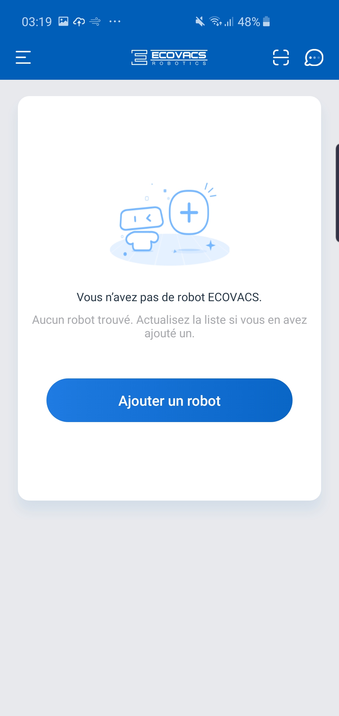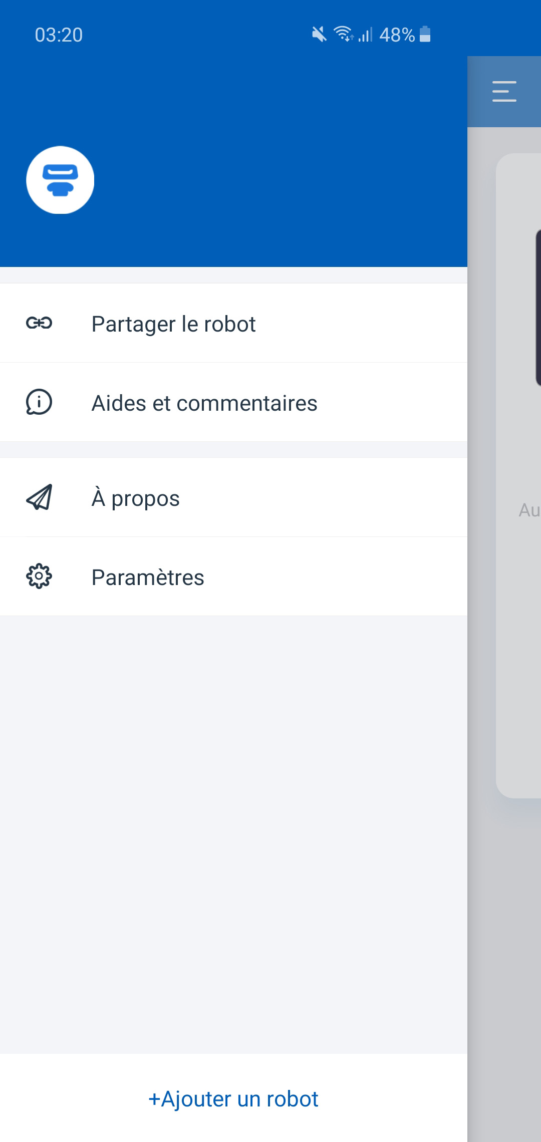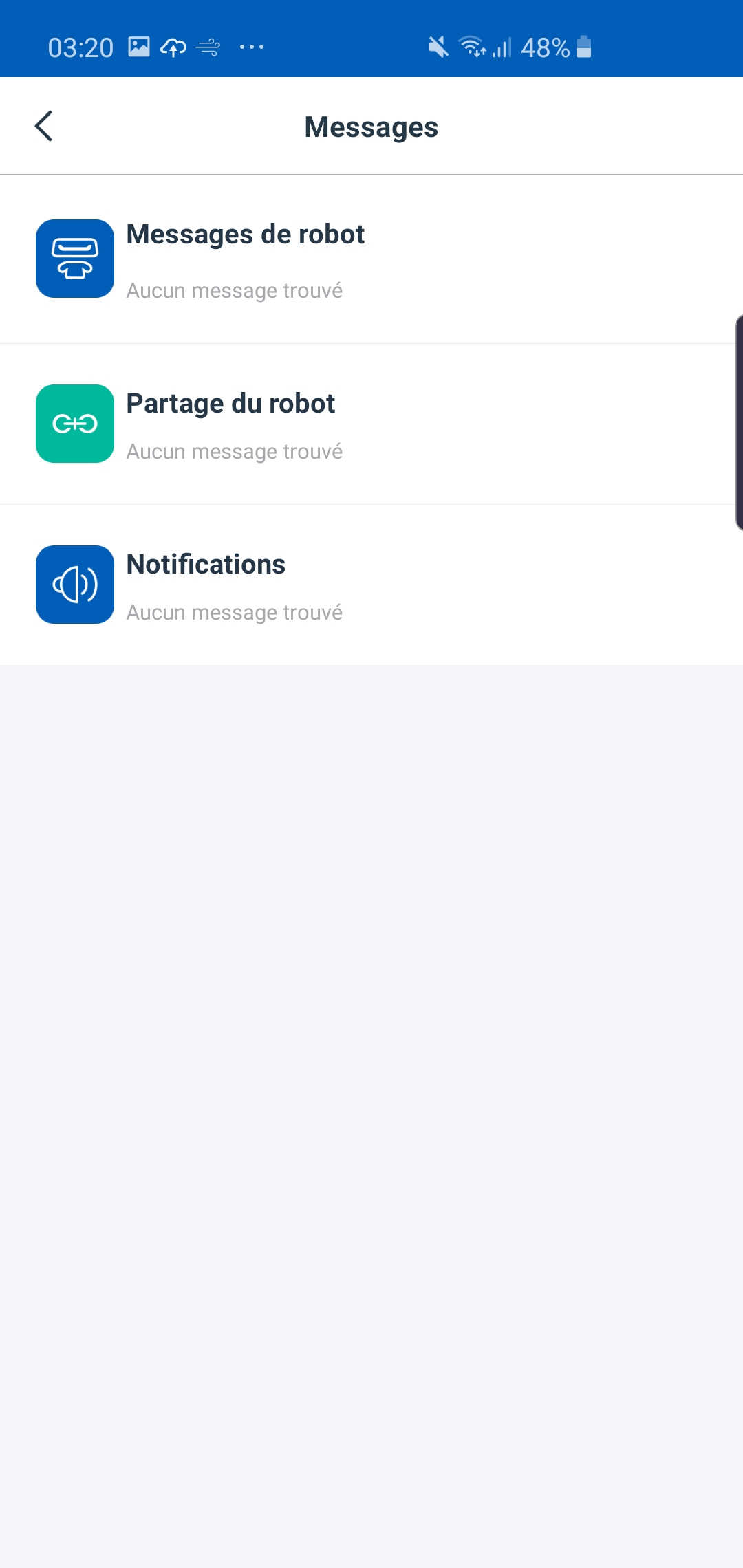 En haut à droite de l’application se trouve un petit pictogramme en forme de bulle. Il s’agit de l’espace « Messages ». Vous y retrouvez les messages en provenance du robot, ceux de partage du robot, et ses notifications d’état.