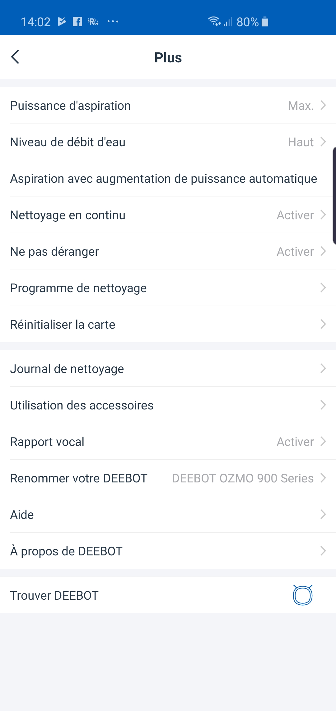 Au centre, de l’application, une carte avec le visuel du Deebot Ozmo 900 nous permet enfin d’accéder aux réglages principaux du robot via trois petits points placés en haut à droite. En emplacement relative classique et que l’on repère sans mal.