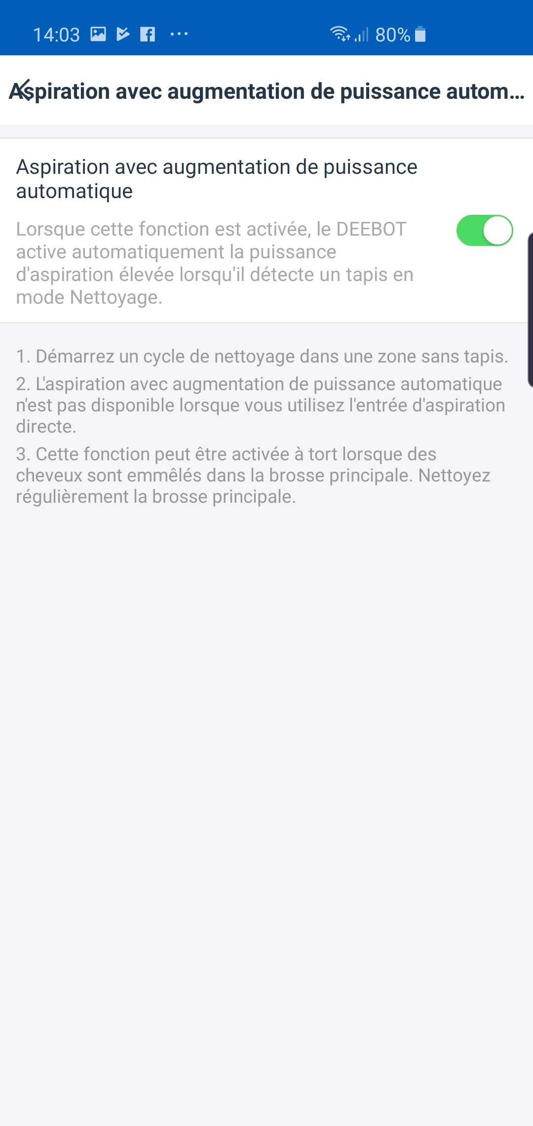 Le deuxième défaut est qu’il n’est malheureusement pas possible de nommer les pièces et donc de demander à notre chère assistante vocale de l’envoyer dans une pièce précise. Bien que nous ne connaissions aucun robot capable de le faire à ce jour, c’est une chose que nous invitons Ecovacs à étudier pour améliorer sa skill. Nous rêverions, en effet, de pouvoir demander à Alexa : « dis à Deebot de nettoyer la cuisine ». Oui, les Alexiens sont exigeants!