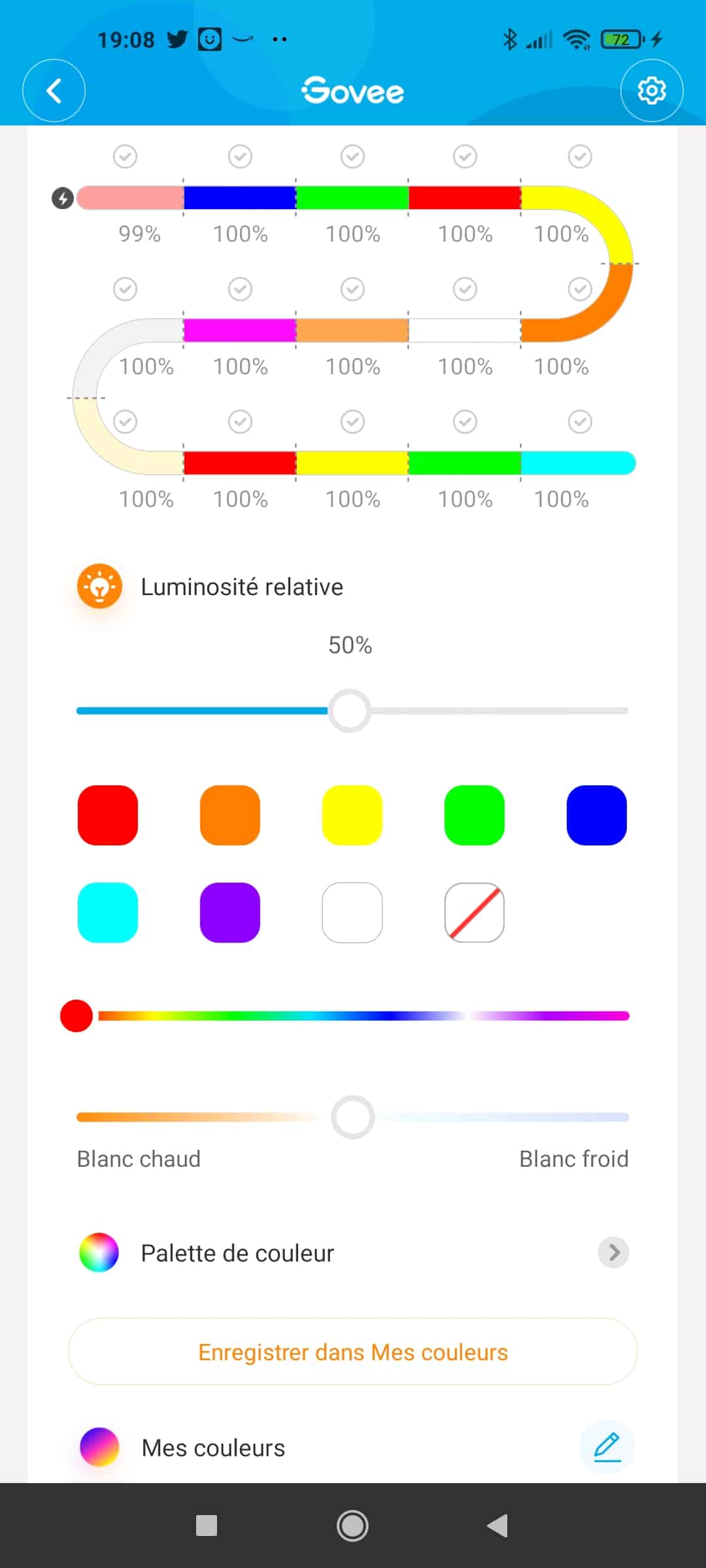 - Couleurs : le ruban disposant de la fonction RGBIC il est segmenter et il est donc possible d’attribuer jusqu’à 15 couleurs différentes et d’en moduler l’intensité de chaque avec « luminosité relative. Nous vous avons présenté la fonctionnalité en détail dans le test du ruban Govee RGBIC.
