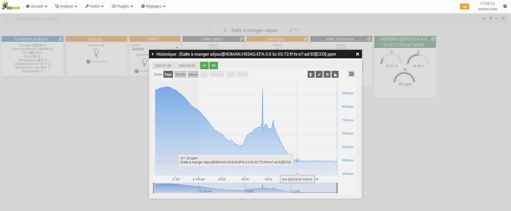 Sur votre Dashboard, vous aurez le visuel de votre capteur de qualité d’air Heiman avec les 3 mesures. En cliquant sur l’une des valeurs, vous afficherez le graphique associé, que vous pourrez modifier comme vous le souhaitez. Par défaut, c’est une courbe de type « aire ». Vous aurez la possibilité de faire des zooms sur l’ensemble de la durée d’utilisation, ou les 30 dernières minutes, l’heure, la journée, la semaine, le mois ou l’année.