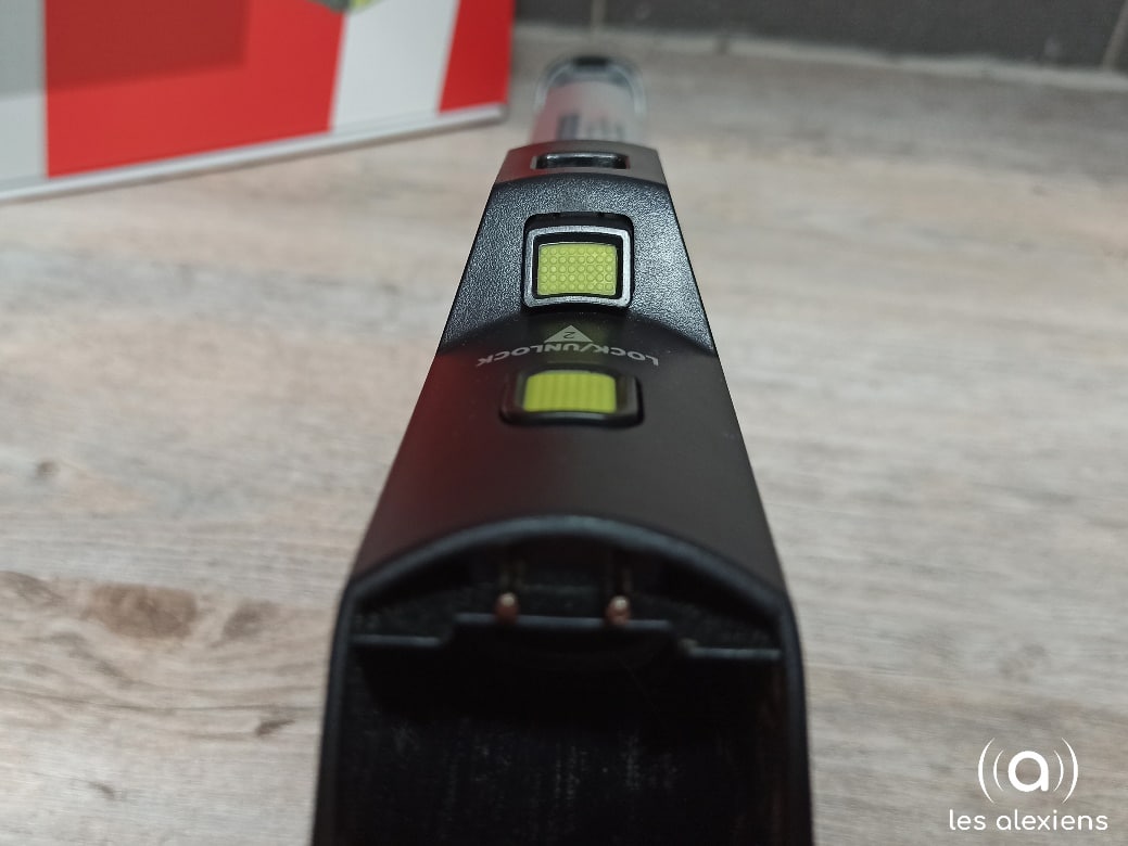 Le H-FREE aime beaucoup les boutons. Il y a les boutons vert anis qui servent à déclipser les différentes parties et accessoires, il y a des boutons pour ouvrir le bac à poussière (vidange simple en ouvrant au-dessus de la poubelle) et également quatre boutons sur la poignée pour :