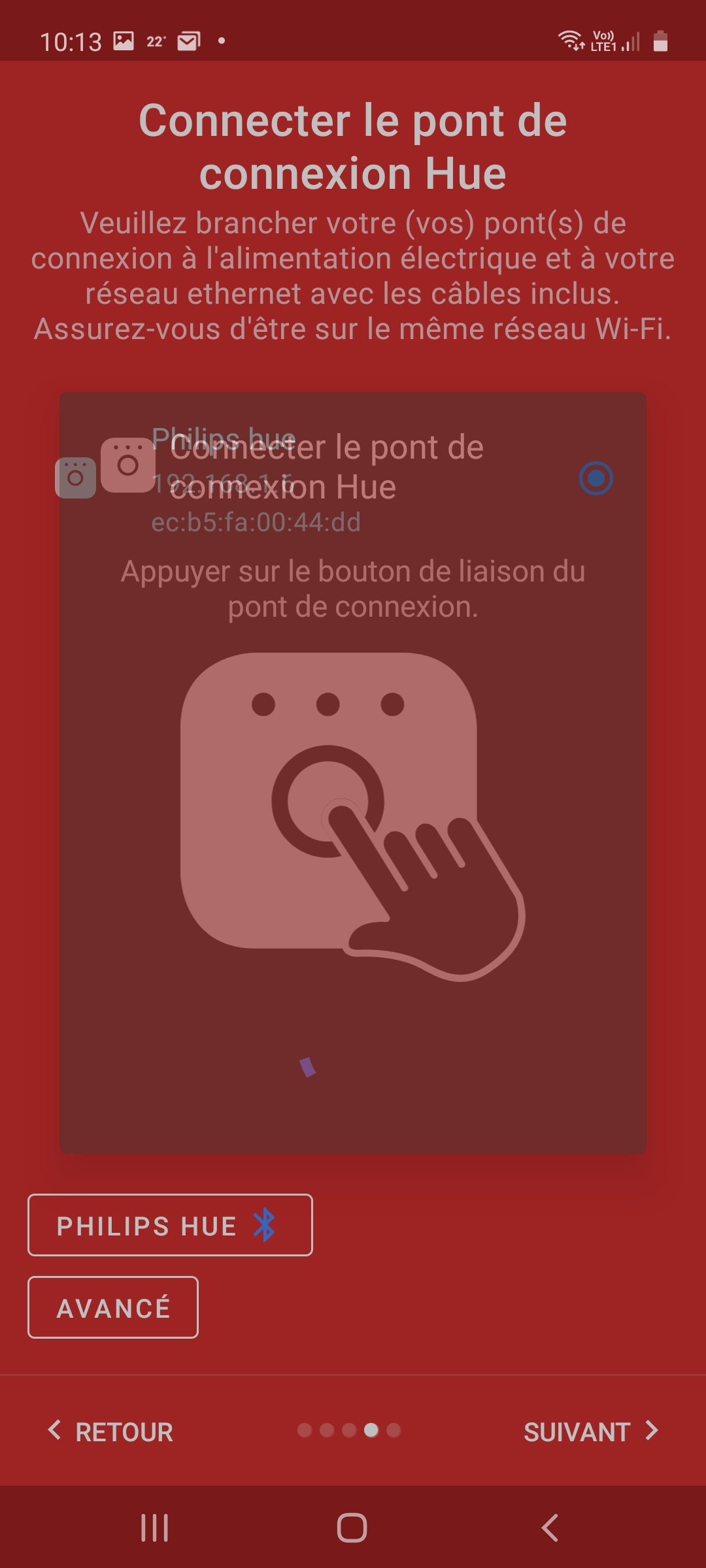 Une fois passé les premières pages de présentation, nous arrivons à… L’essentiel ! Le pont est directement détecté par l’application. En cliquant sur suivant, il nous est demandé de procéder à l’appairage en appuyant sur le bouton central du hub. Ceci fait, l’écran suivant nous informe que la procédure est réussie et terminée. Chouette alors !