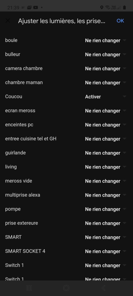 Et bien, là la remontée n’a posé aucun problème ayant déjà installé par le passé le service Philips Hue qui est associé à notre compte pour le contrôle de la maison. La commande vocale « Allume/Éteins ». se fait sans difficulté. Le nombre de couleur est ici aussi limité avec six proposition de teintes dont cinq….qui ne servent à rien ! En effet, seul « incandescent » est actif. La même réaction que dans l’application précédente, la coche ne reste pas sur une intensité autre.L’exécution d’une routine n’a pas posé de problème.