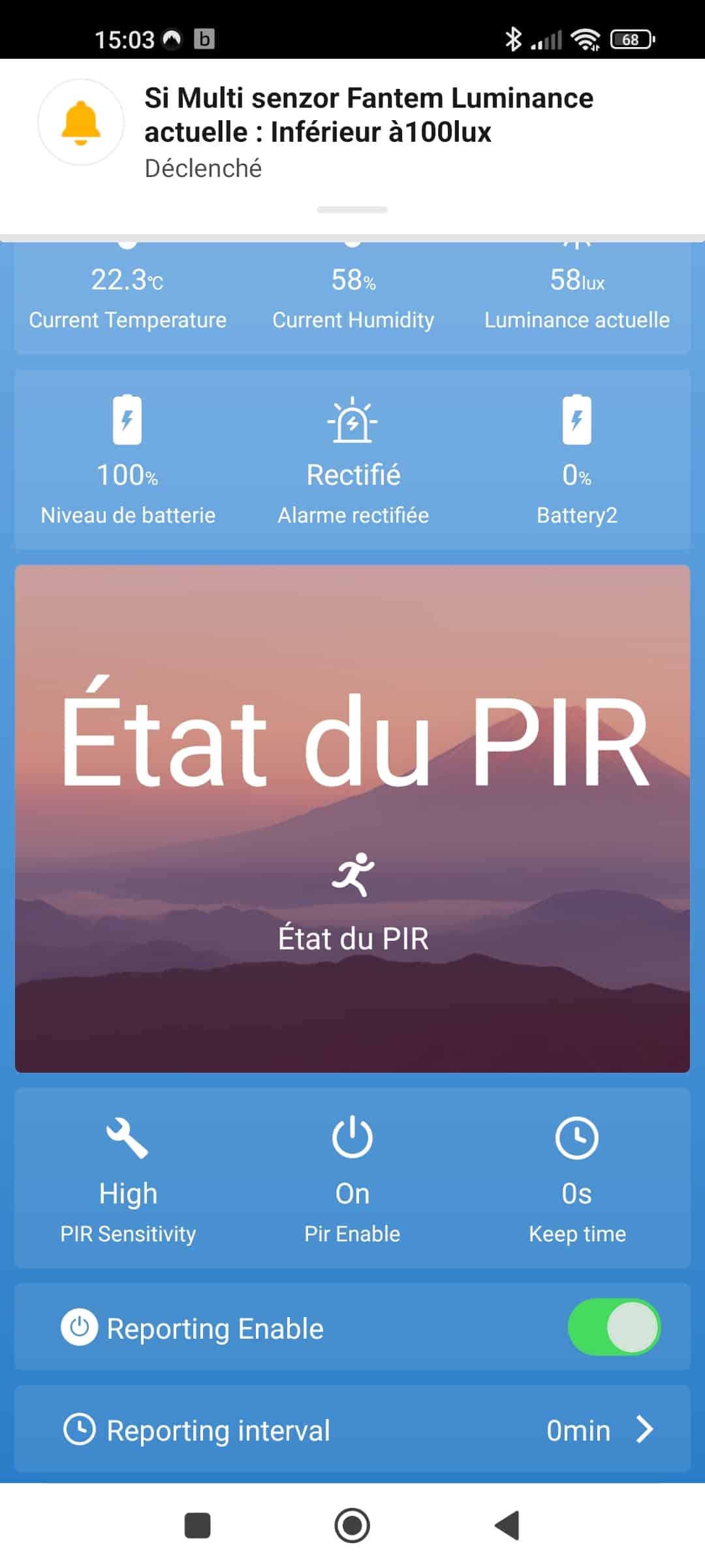 Et cela fonctionne très bien. Nous avons bien reçu des notifications à chaque déclenchement du capteur Immax Neo.