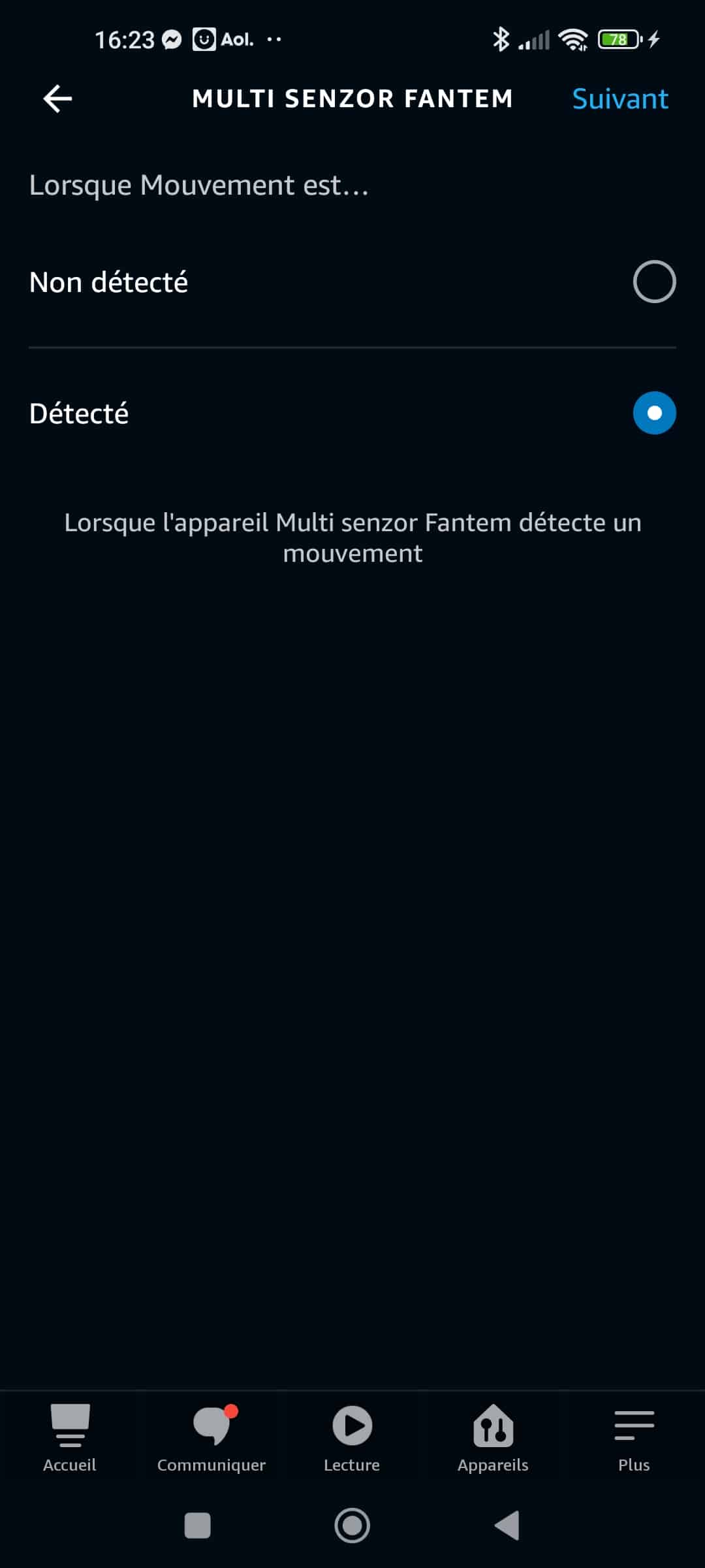 Au centre l’état du capteur de mouvement (la traduction n’est pas des plus pure mais reste compréhensible). Autant le dire de suite, la détection de mouvement n’entraine pas de notification nativement. Ici, il faut que la page soit affichée sur votre smartphone pour voir l’état changé. Mais comme nous allons le voir plus loin, via le menu Scene, cela fonctionne parfaitement. OUF.