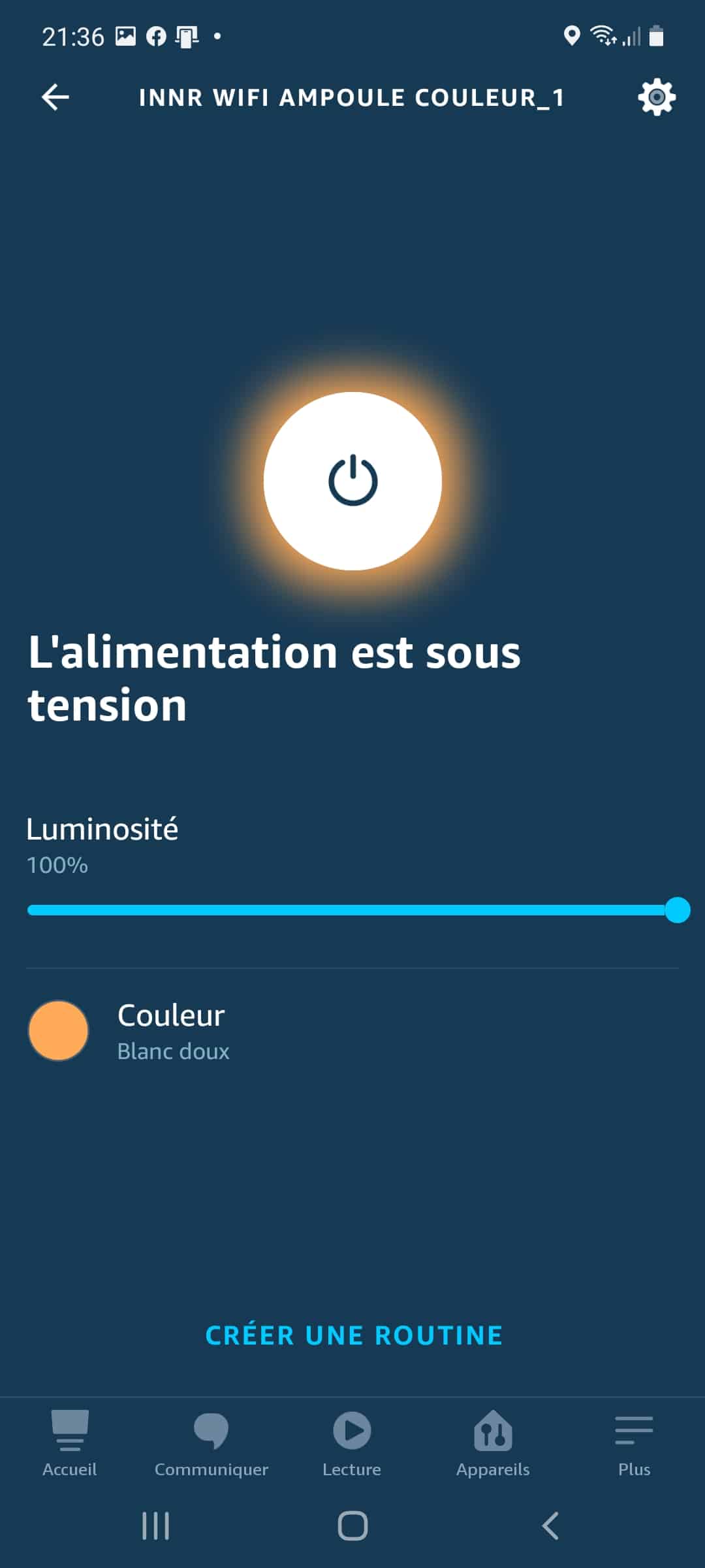 Si vous n’avez pas déjà installé la skill Innr c’est le moment de le faire. Une fois le compte Amazon lié à celui de l’application, les ampoules Innr Wifi remontent immédiatement dans l’application. Vous pouvez également cliquer pour allumer/éteindre, moduler l’intensité ou changer de couleur parmi les cinq blancs et 15 couleurs proposés. Les routines sont bien évidemment possibles.