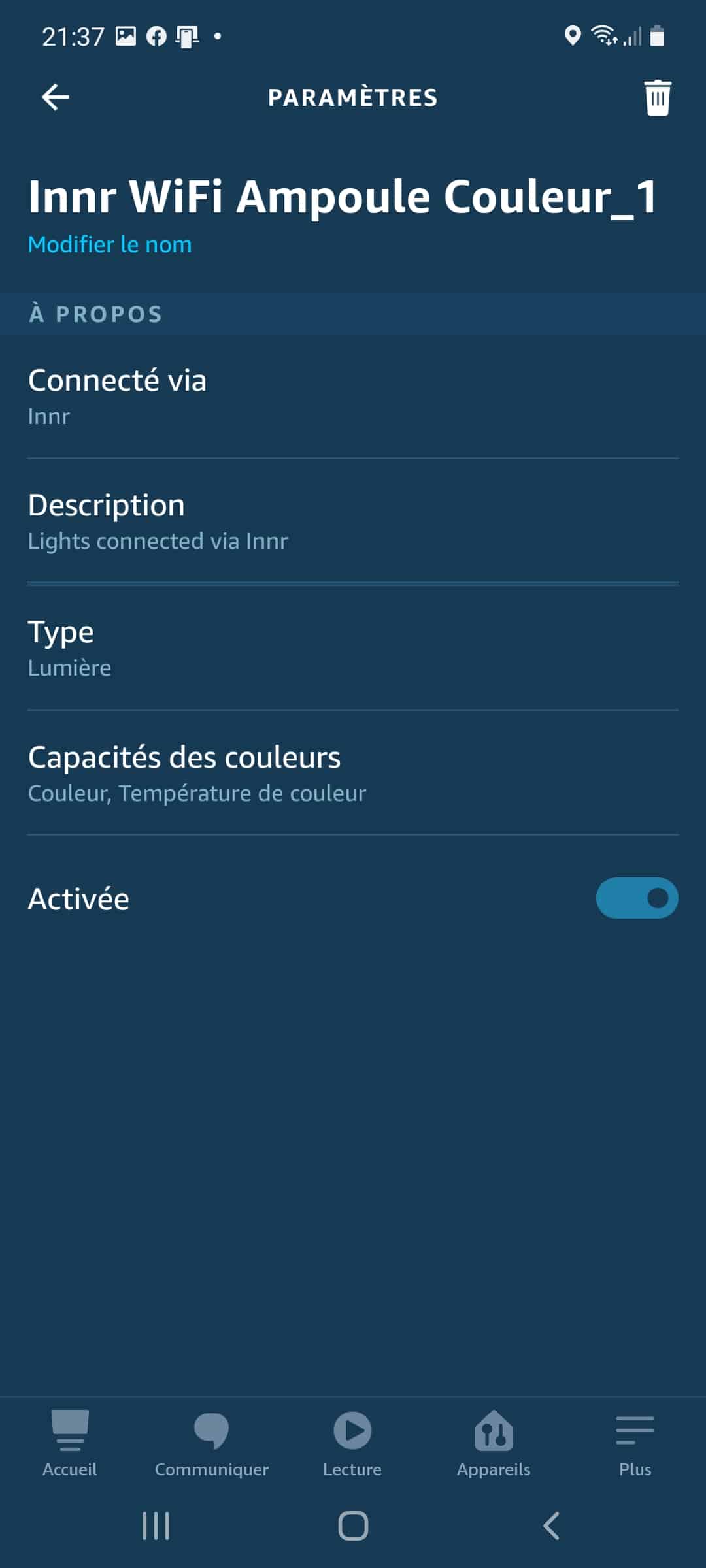 La reconnaissance se fait très vite. Lorsque l’appairage est ok, l’ampoule clignote une fois et l’opération terminée, elle apparait sous la dénomination « Innr WifI Ampoule Couleur_1 ». La même procédure est à effectuer, bien sûr pour chaque ampoule. Il vous est proposé, à la fin de l’installation, de choisir une pièce de destination, mais vous pourrez faire cela ultérieurement dans les paramètres tout comme changer le nom, en cliquant sur le crayon car il est franchement un peu long pour demander à Alexa ou même Google une action. D’emblée, il est également proposé d’incorporer l’ampoule à une routine. Si, comme nous, vous avez entre les deux ajouts installé la skill Innr, vous pouvez voir qu’Alexa remonte bien les ampoules dans son application.
