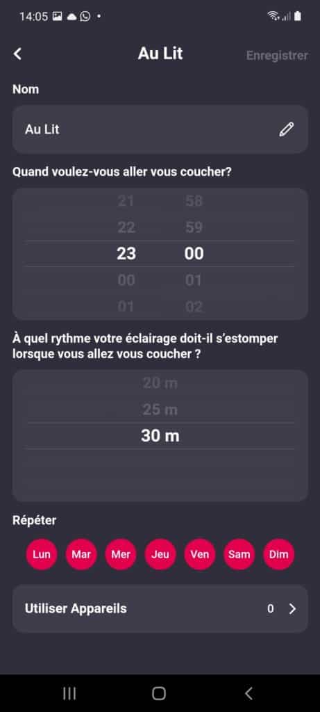 Nous avons tout particulièrement apprécié ces deux dernières fonctions qui permettent d’effectuer une extinction le soir ou un réveil en douceur avec la lumière en modulant le timing proposé entre 1 et 30 minutes. Définissez, par exemple, à quelle heure vous souhaitez que la lampe s’éteigne et le délai à partir duquel l’intensité va diminuer. C’est très sympa.