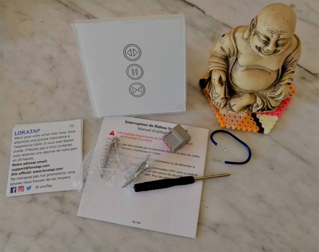 Que trouvons nous dedans ? L’interrupteur, quatre vis, un petit tournevis, un Wago 3 entrées, un bout de fil bleu et un guide d’installation rapide en Français.