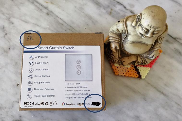 L’interrupteur est livré dans un carton faisant penser à du fait main : il est marron, il est petit, il est moche, les autocollants ne sont pas vraiment bien collés et… il est gribouillé au stylo à bille : FR a été ajouté et un item a été effacé de façon manuelle. Bon… On part avec un sérieux doute, mais nous avons déjà vu des emballages assez basiques avec de bons produits. Cela dit, en tant que consommateur, on a un doute sur la qualité. Mais ne nous laissons pas influencer…