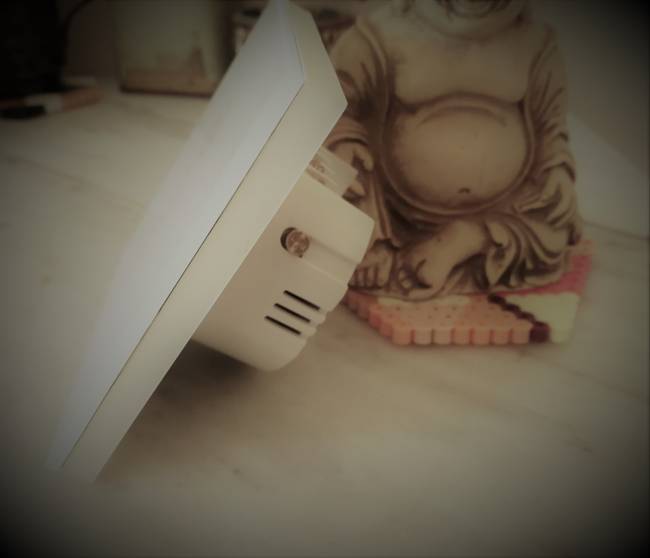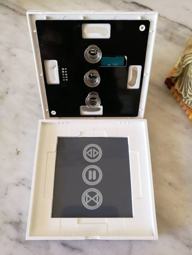 Niveau design, nous sommes sur un beau produit mais quasiment identique aux autres interrupteurs connectés. La façade de l’interrupteur est en verre trempé de 4 mm avec un fond blanc, trois zones de pression. C’est épuré, c’est sobre, c’est joli mais ça fait vraiment marque blanche : aucune identification, aucune mise en valeur. Les trois boutons sont ouverture / pause / fermeture des rideaux. Les dimensions sont assez standard pour la façade (8,6 cm de côté) et une profondeur de 2,5 cm pour le système de repiquage. Une fois mis en place et bien collé au mur, comptez un petit centimètre d’épaisseur. Donc identique aux autres.