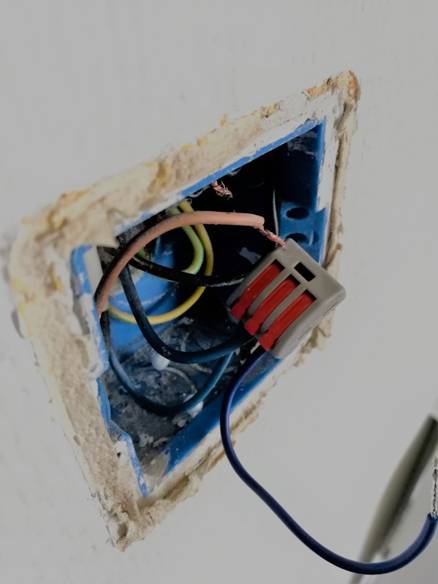 Soit… Nous allons donc utiliser le Wago et le fil car ils doivent servir à cela, mais la notice n’en parle pas. Premier problème, où placer ce Wago qui est assez volumineux et qui va venir prendre de la place dans le bloc ? Nous repenserons à cela plus tard… Ou pas. Mais faisons les branchements. C’est bien car les couleurs sont notées sur le bloc de connexion. Tous les fils se mettent bien, hormis le neutre, très malléable et il est quasiment impossible de savoir s’il est trop ou pas assez enfoncé… Après fixation, ça tient, donc il doit l’être assez.