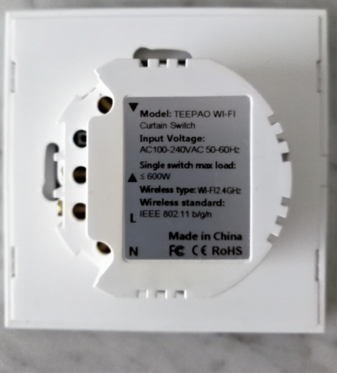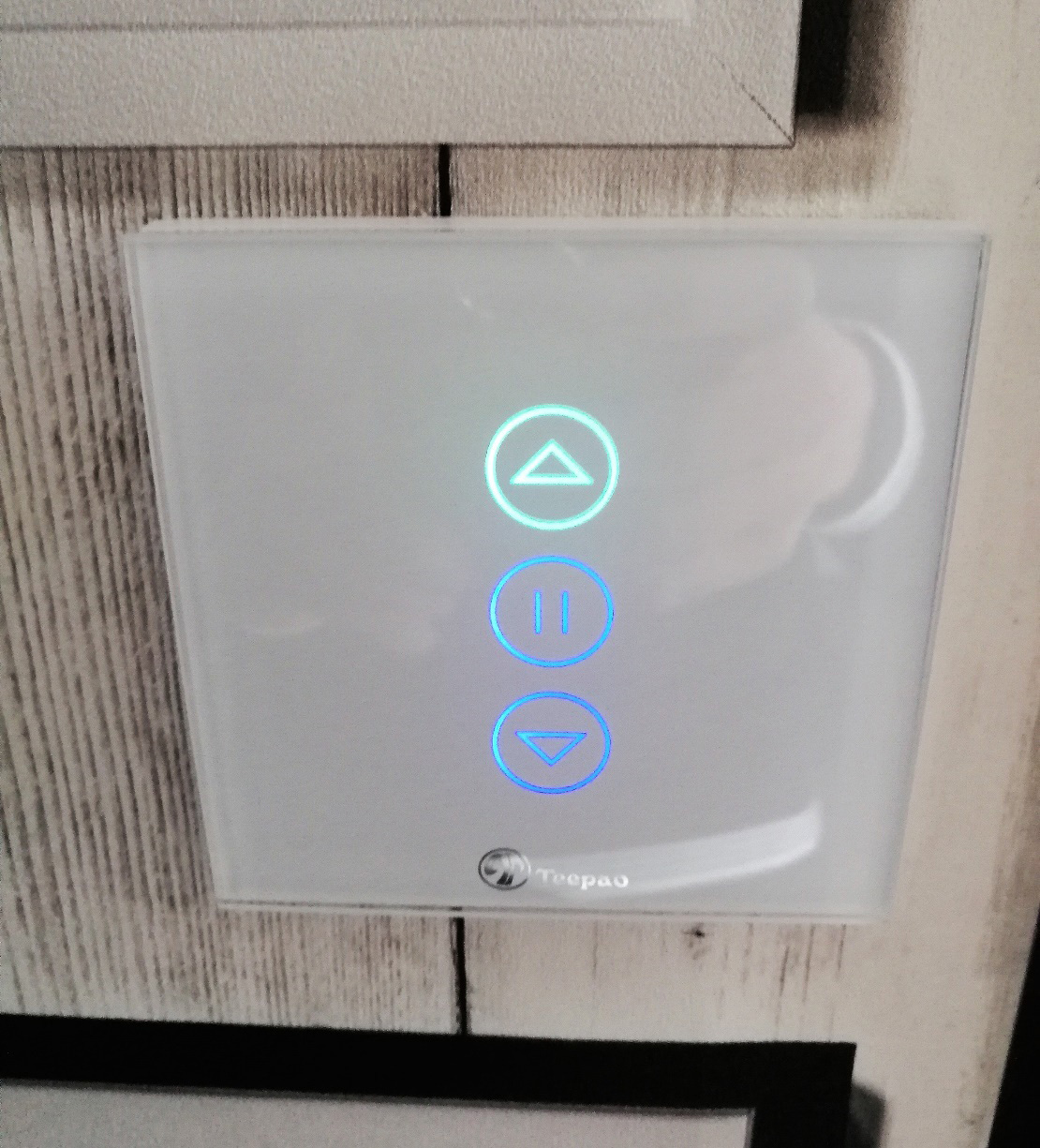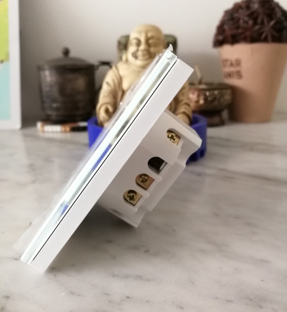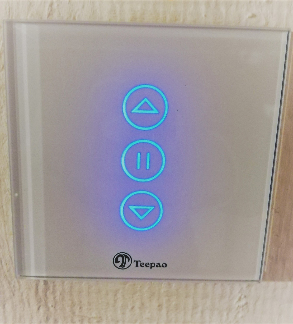 Niveau design, nous sommes encore sur un beau produit. Il y a des différences plus ou moins subtiles avec la précédente version. La façade de l’interrupteur est en verre trempé de 4 mm avec un fond blanc, trois zones de pressions et, une nouveauté, le logo du modèle. Les symboles ouverture/pause/fermeture sont eux aussi remis à niveau. Ils sont plus adaptés à ce genre d’interrupteur que ceux avec des flèches horizontales, qui font penser à des interrupteurs pour tringles à rideaux mécaniques. Cela fait plus « pro ». Bonne initiative, joli produit. Les dimensions sont standard pour la façade (8,6 cm de côté) et une profondeur de 2,5 cm pour le système de repiquage. Une fois mis en place et bien collé au mur, comptez un centimètre d’épaisseur.