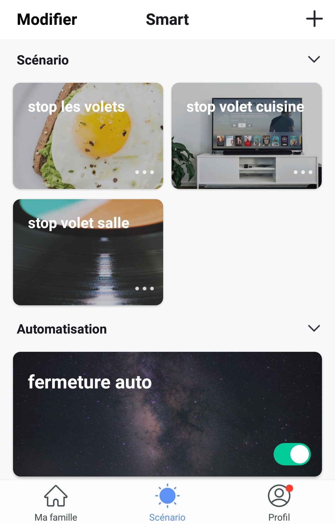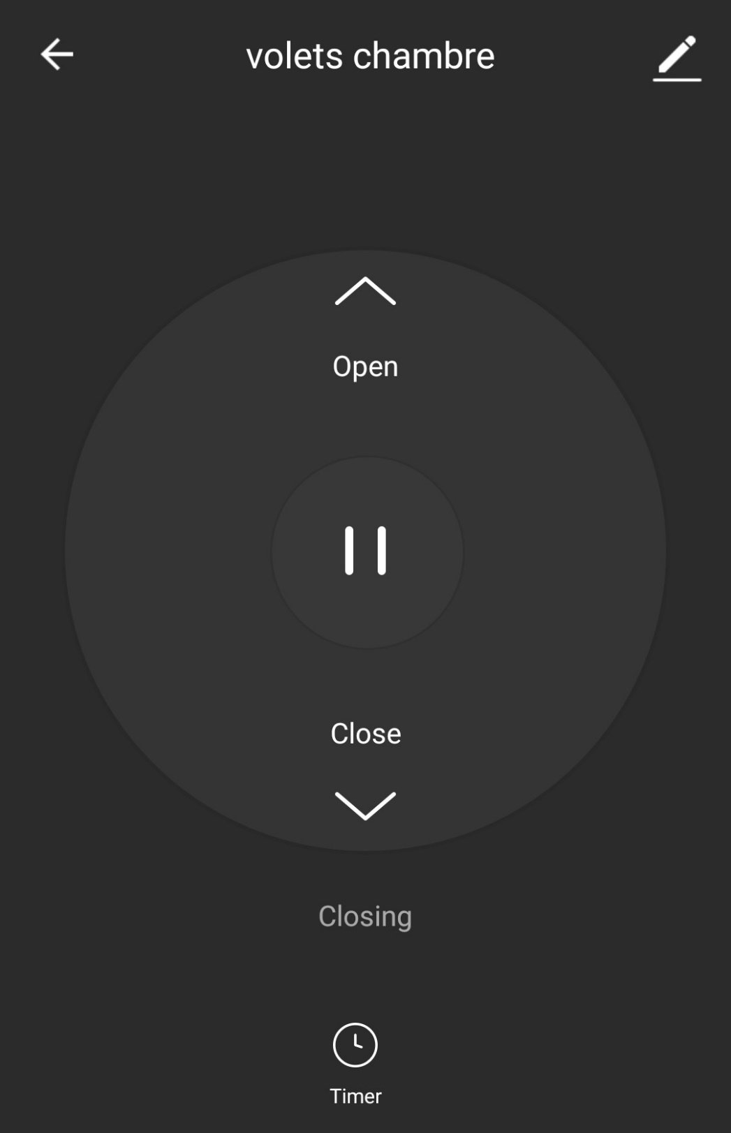 - A l’heure actuelle, il n’est pas possible, sous Smart Life, de contrôler la fonction « pause » en cours de descente ou de montée (le bouton du milieu). Il faudra pour cela passer par un scénario sous Smart life et le mettre ensuite dans une routine sous Alexa (cf. tuto).