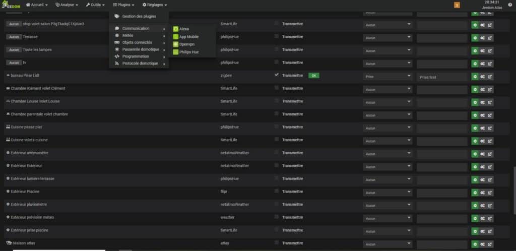 - Les plugins en eux même : entrez dans l’extension dédiée et ainsi vous pourrez l’utilisez à 100%. Par exemple, avec l’extension Alexa, vous viendrez choisir les appareils à faire remonter, avec celle ZigBee, vous pourrez en installer de nouveaux…