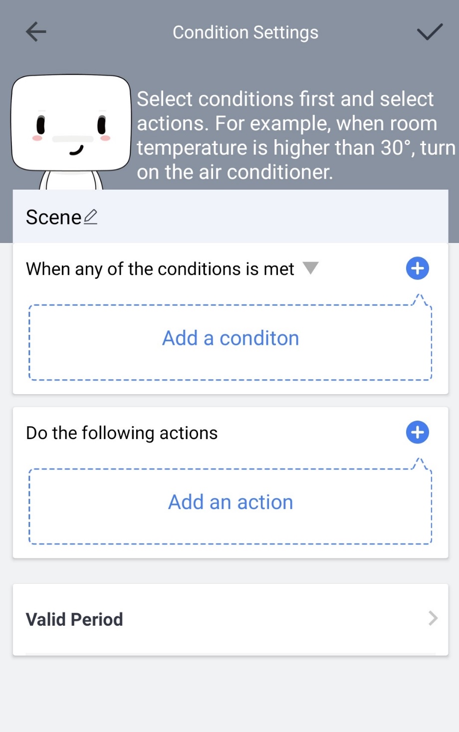 Les scènes se créent depuis le menu « Scene » dans le menu principal. Vous pouvez choisir la température ou l’humidité à partir de laquelle (ou lesquelles car vous pouvez faire une double entrée) la scène va s’activer (notion de supérieur à ou inférieur à, par exemple : Plus de 24°C) ? L’action va consister à activer un appareil, comme dit plus haut.