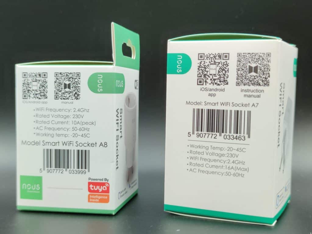 Quoi que le vert semble être la couleur de la marque NOUS, il se décline ici en deux nuances selon le modèle. Vert gazon pour la prise ronde et vert d’eau pour la carrée. Du coté encombrement, les prises sont plutôt petites et les boites le sont tout autant. Sur chacune, on retrouve le visuel de la prise avec le logo des assistants vocaux Amazon Alexa et Google Assistant avec lesquels elles sont bien entendu compatibles. Sur les côtés, on découvre des QR codes qui renvoient sur l’application maison ou le manuel d’utilisation (proposés également dans un flyer à l’intérieur de la boite). Et, bien évidemment, les caractéristiques techniques de chacune.