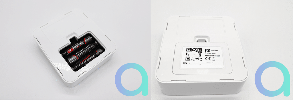 Les 3 piles AAA, offrant une autonomie de 2 ans, s’insèrent à l’arrière du module, sous la zone où vous collez le velcro. Sur le capot se trouve le numéro de série et un QR Code servant à l’installation de l’appareil. Il suffit de scanner le code pour associer le détecteur à son compte.