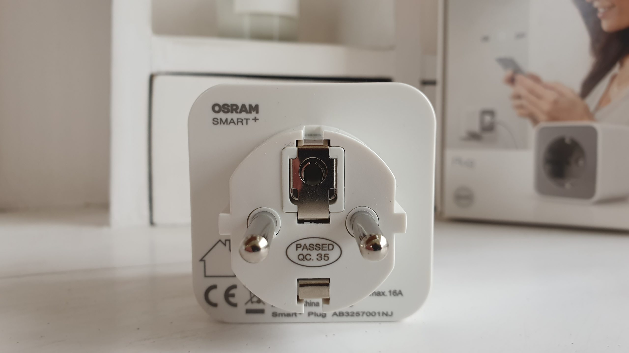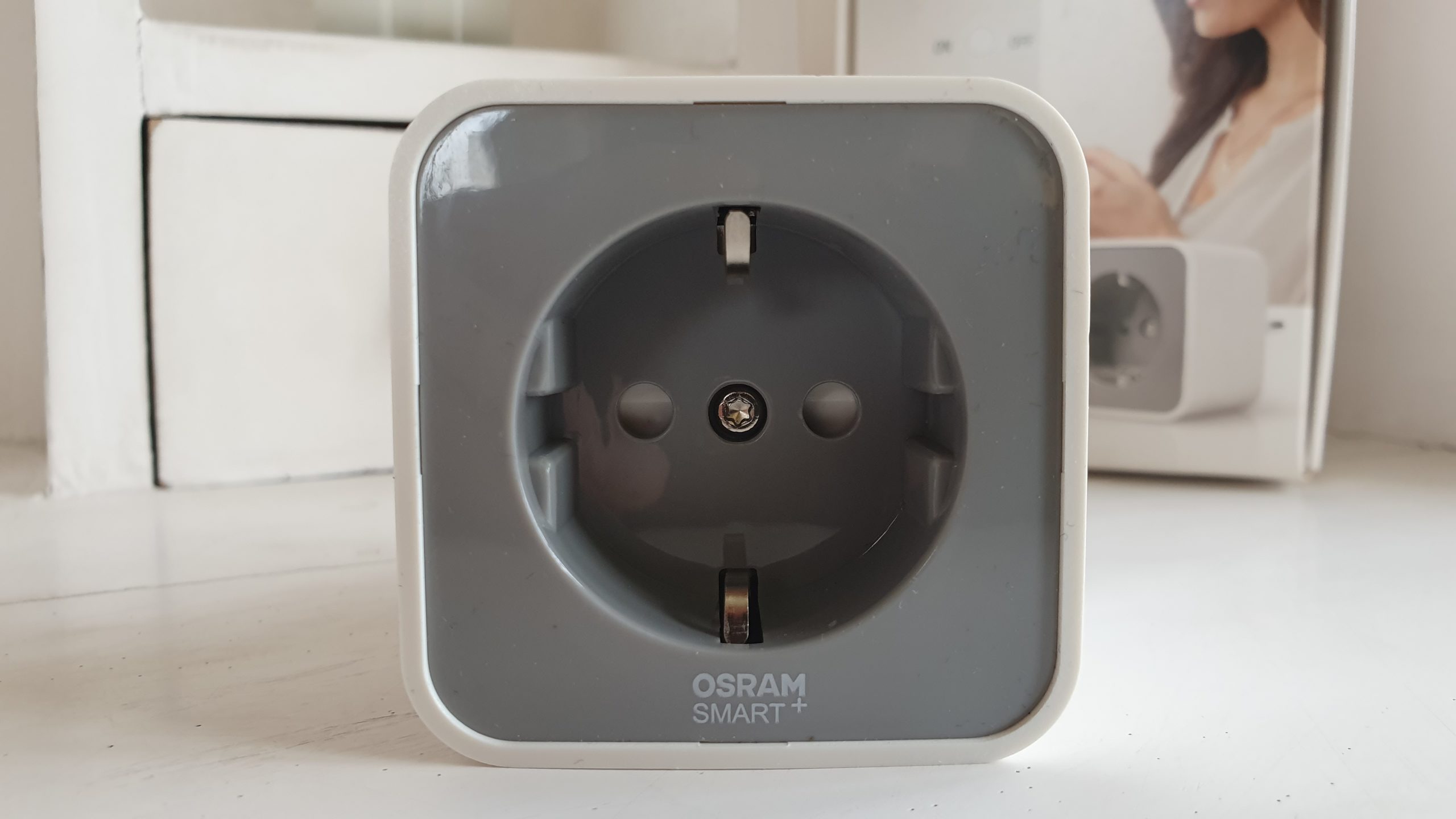 A l’ouverture, la prise est parfaitement sécurisée dans l’emballage et accompagnée d’une notice d’utilisation exhaustive. De forme presque cubique (c’est plutôt une pyramide tronquée en fait), elle mesure 8,4 x 6 x 6 cm. Son habillage est bicolore : contour blanc et façade gris clair ornée d’un logo « OSRAM SMART+ » blanc. C’est élégant et les finitions ne souffrent pas du moindre défaut. Nous sommes clairement face à un produit haut de gamme. Son poids de 104 grammes, plutôt conséquent, vient d’ailleurs appuyer cette première impression de qualité.