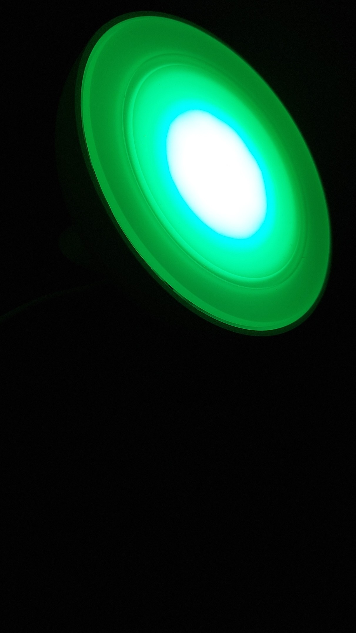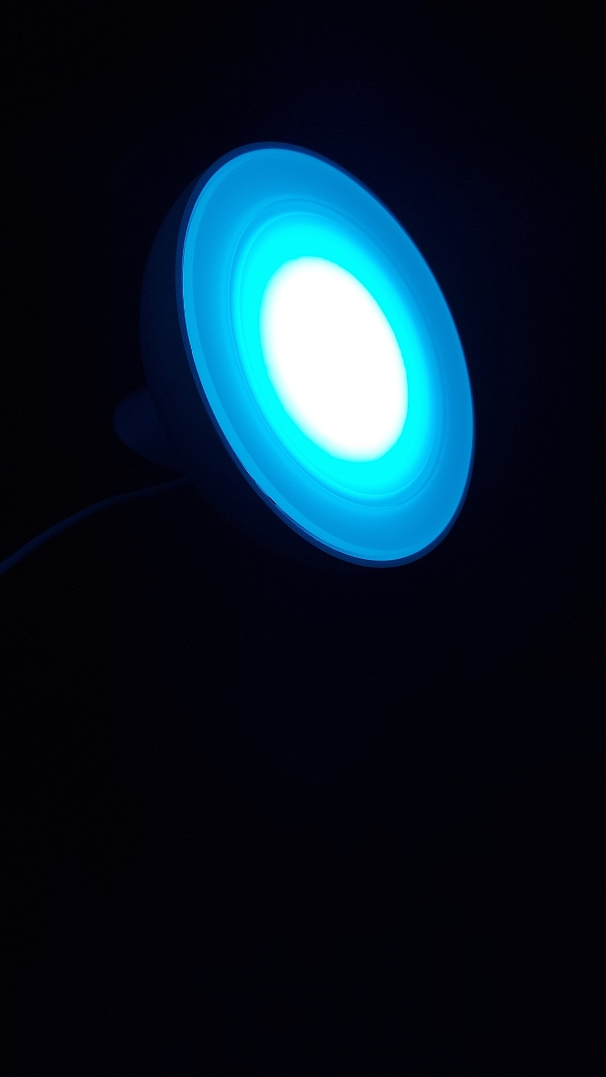 C’est une vitre opalescente toute en plastique qui recouvre la LED de 7.1 Watts pour 500lm ce qui est tout à fait correct pour une utilisation salon et peut être même trop pour une chambre mais à moduler selon sa superficie. Au centre en toute discrétion est incrusté « Philips Hue ». La coque est en plastique luisant dans sa partie inférieur et métal aspect sableux dans la partie supérieure. Le câble se relie par la prise DC au bloc secteur 24V sur lequel on vient clipser la fiche voulue.