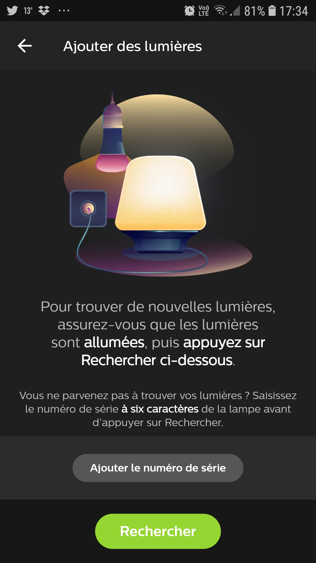 Revenez à la page précédente pour cette fois choisir « configuration de la lumière », la recherche de lampe s’affiche. Il est simplement nécessaire de mettre l’ampoule sous tension, pas de mode appariement à mettre en œuvre. Et voilà, l’ampoule est détectée. (Vous pouvez alors changer le nom de l’ampoule pour une utilisation simplifiée).
