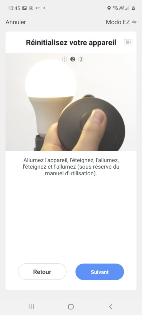Effectuez trois extinctions et quatre allumages afin que votre plafonnier LSC soit prêt pour la procédure d’appairage, cochez bien la petite case « voyant de confirmation dans le flash ». La reconnaissance démarre.
