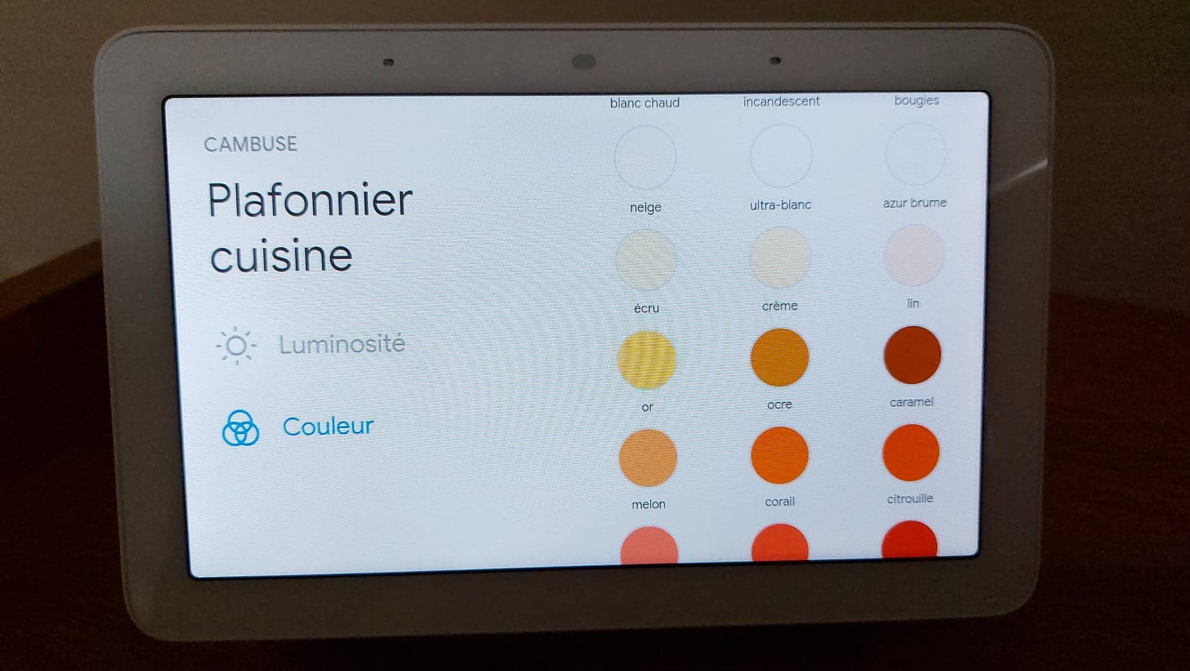 Depuis l’écran du Google Nest Hub, en plus des pastilles de couleurs, leur nom s’affiche et il est possible d’avoir une large gamme de couleurs particulières en mode tactile. Toutefois bien que Google Assistant propose un nombre bien supérieur à Alexa, il n’est pas en capacité de répondre en vocal qu’aux couleurs classiques, à part quelques trop rares exceptions.