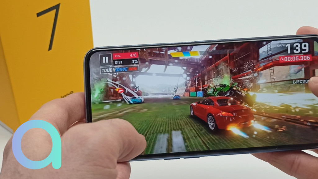 La taille même de l’écran va permettre à la fois de s’immerger dans les jeux mais aussi dans vos vidéos. C’est un format 20:9, bien plus large qu’un 16:9 et permettant une vision périphérique plus importante pendant le gaming. Nous sommes également sur un écran LCD FHD+. Le FHD+, c’est du 2400 x 1080, 16,7 millions de couleurs. Oui, nous ne sommes pas sur du OLED mais du LCD. Cela veut dire un écran avec des contrastes et des détails moindres. Pour pallier cela, Realme a opté pour un taux de rafraichissement à 90 Hz au lieu des 60 habituels. Ainsi, le R7 gagne en profondeur de couleurs et gestion des contrastes, mais pas de miracles non plus pour les plus exigeants.